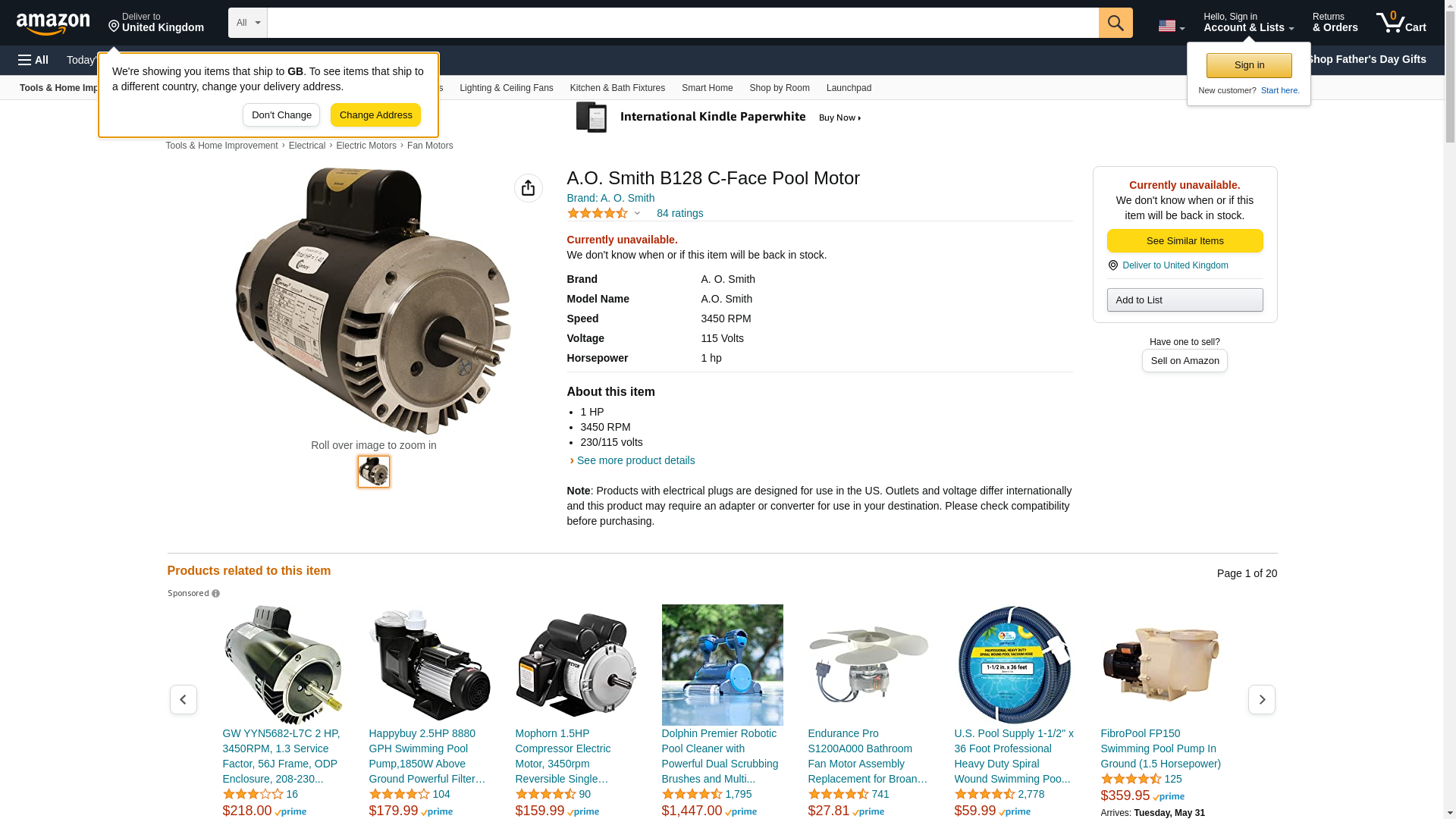 � Part Number: B128 � Manufacturer: AO Smith � Weight: 25.2 pounds � Dimensions: 17x9x10-1/2 inches � Shaft diameter: 5/8 inch � RMP: 3450 RPM � Motor: 115 volts, 14.4 amps The AO Smith Replacement 1 HP Threaded Shaft Motor - B128 is a replacement shaft motor for spas and pools. The AO Smith B128 pool shaft motor features a 1 HP motor and can be placed on several types of pumps. The threaded B128 AO Smith shaft motor powers the pump so that it can effectively move water throughout the pool or spa. With 3450 RPM, the B128 shaft motor has one speed and fits any C-face pool motor mount.