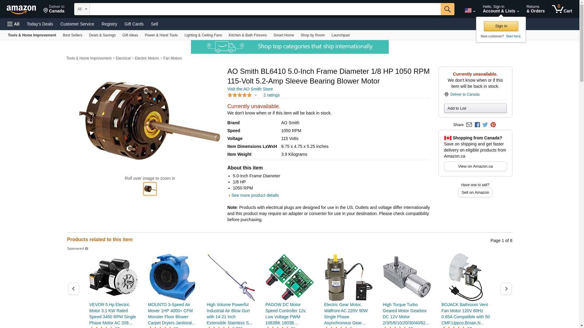 AO Smith BL6410 5.0-Inch Frame Diameter 1/8 HP 1050 RPM 115-Volt 5.2-Amp Sleeve Bearing Blower Motor. 5.0-Inch Frame ...