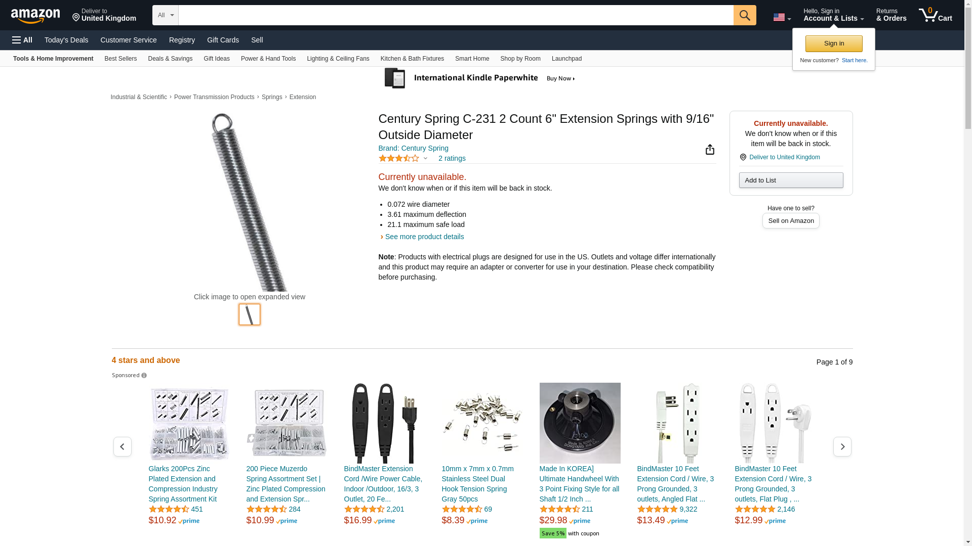 Sold as 4 UNITS at $5.26 per unit. (1 unit = each.) Steel. Dia. x OD x OA length show below. Polybag of 2. .072x9/16"x6". Manufacturer number: C-231. SKU #: 5214234. Country of origin: (TBA). Distributed by Century Spring Co, Inc.