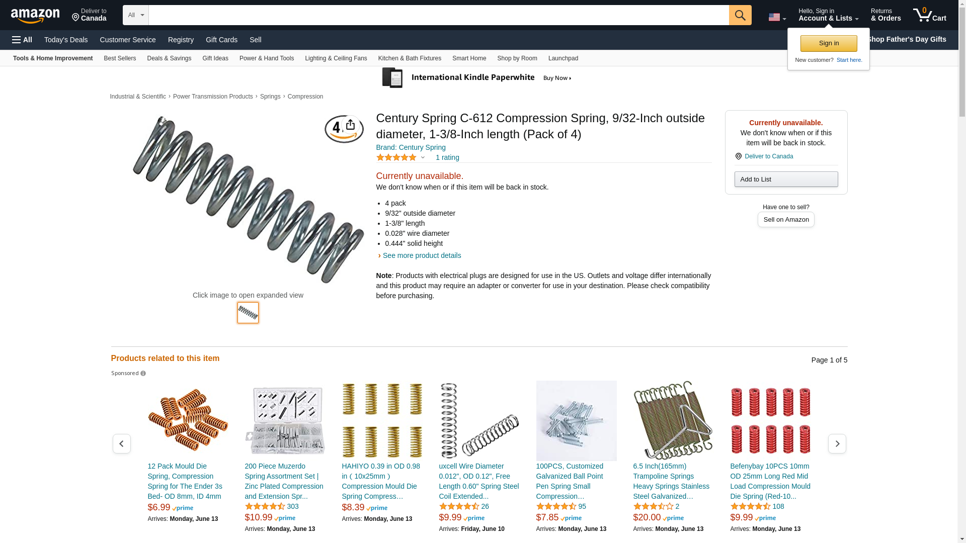 Sold as 5 UNITS at $4.04 per unit. (1 unit = each.) Steel. Dia x OD x OA length shown below. Polybag of 4. .025x9/32"x1-3/8". Manufacturer number: C-612. SKU #: 5214523. Country of origin: (TBA). Distributed by Century Spring Co, Inc.