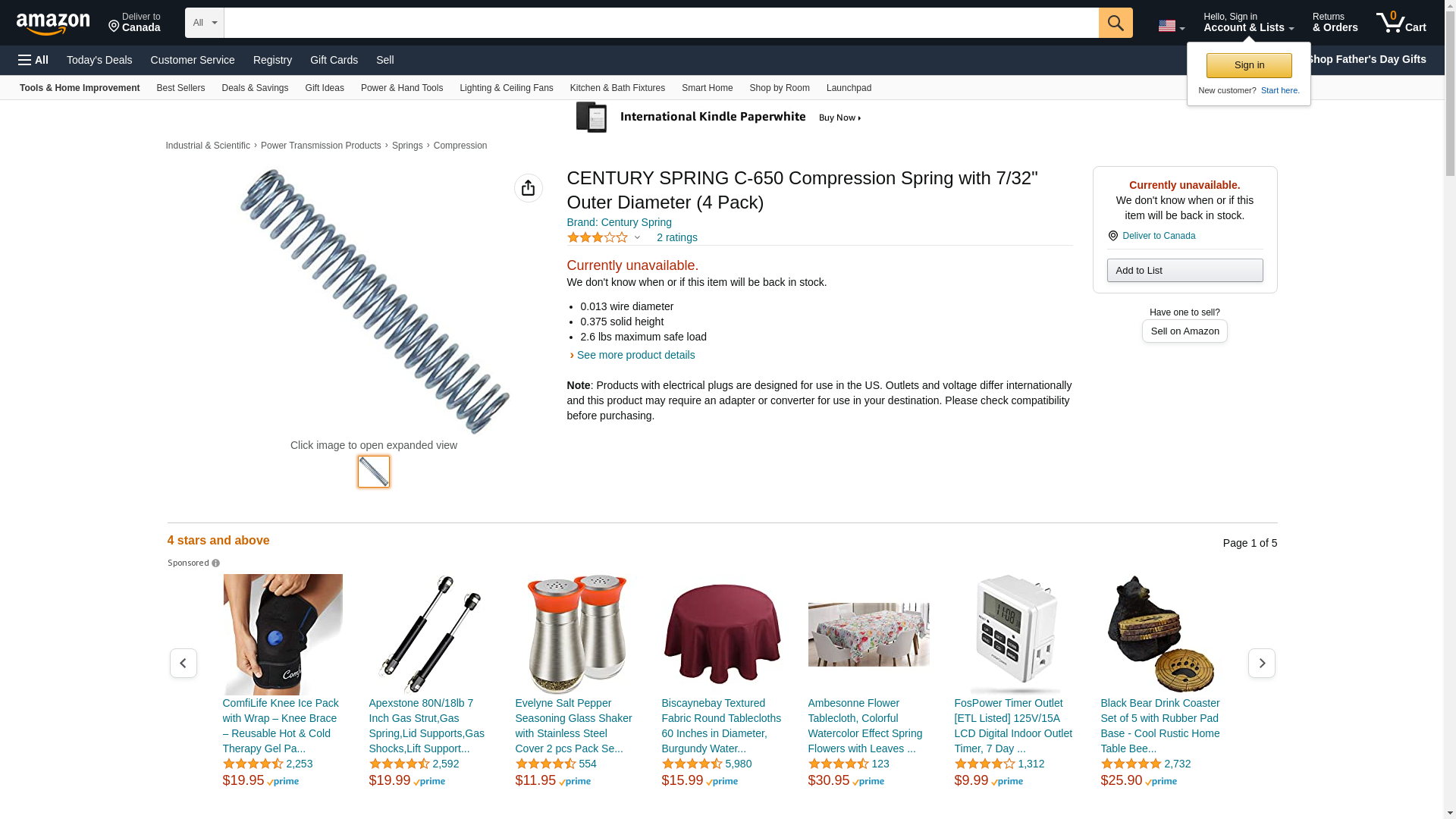 Sold as 5 UNITS at $4.22 per unit. (1 unit = each.) Steel. Dia x OD x OA length shown below. Polybag of 4. .041x7/32"x1-1/16". Manufacturer number: C-650. SKU #: 5214564. Country of origin: (TBA). Distributed by Century Spring Co, Inc.
