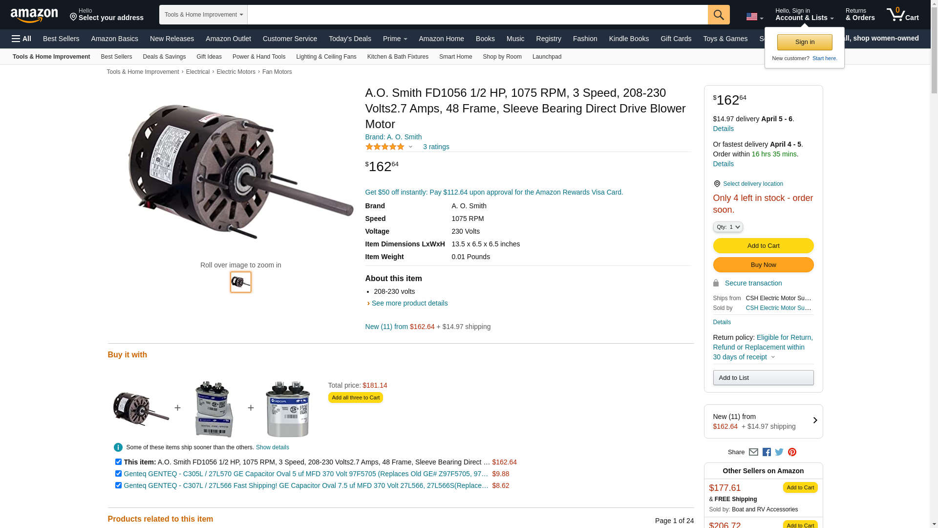 A.O. Smith FD1056 1/2 HP, 1075 RPM, 3 Speed, 208-230 Volts2.7 Amps, 48 Frame, Sleeve Bearing Direct Drive Blower Moto...