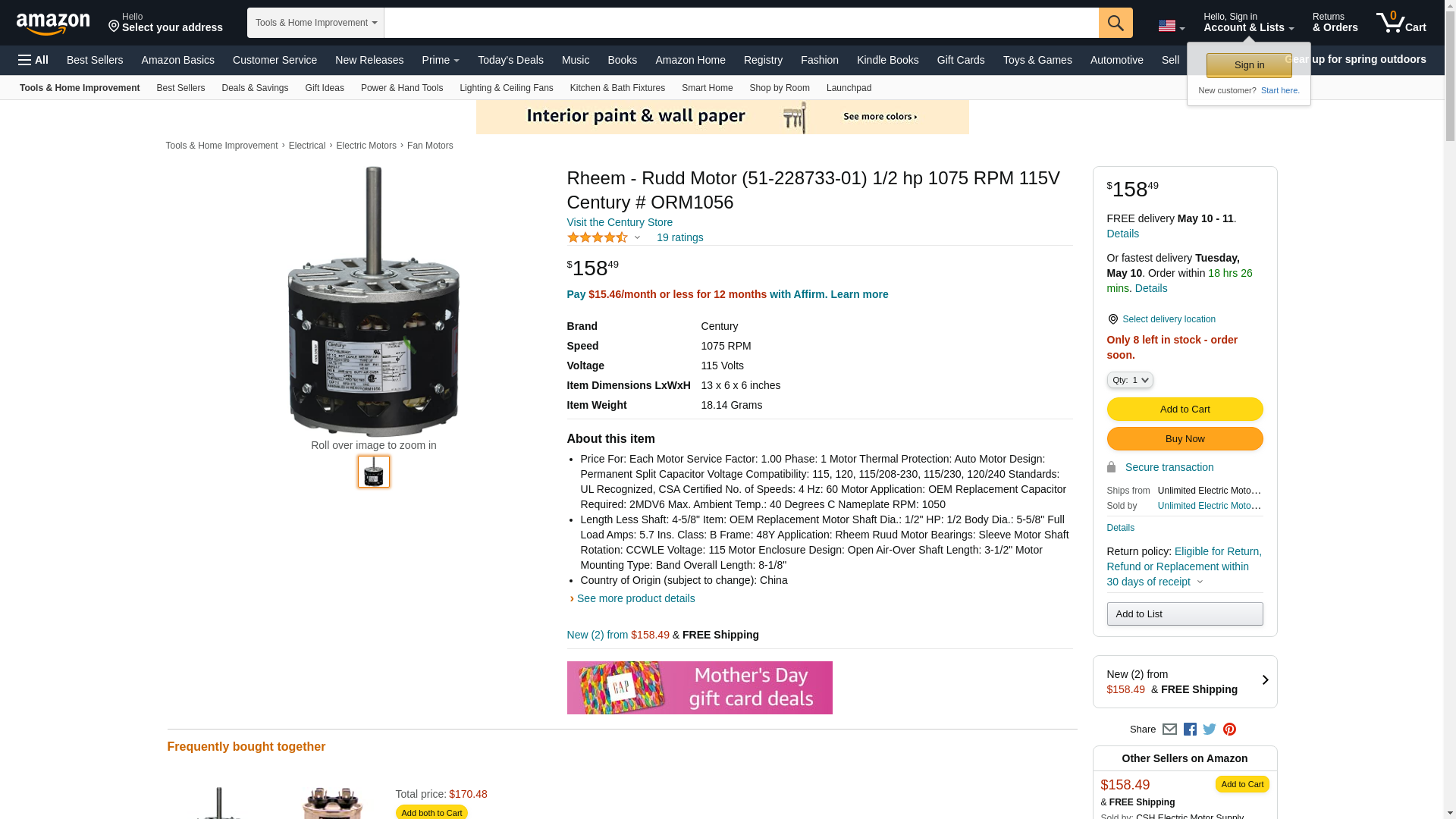 Rheem - Rudd Motor (51-228733-01) 1/2 hp 1075 RPM 115V Century # ORM1056