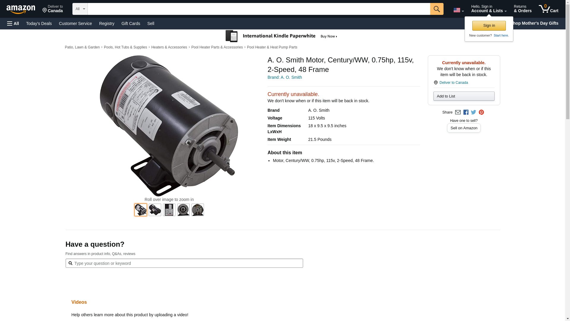 | Feature | Motor, Century/WW, 0.75hp, 115v, 2-Speed, 48 Frame. |