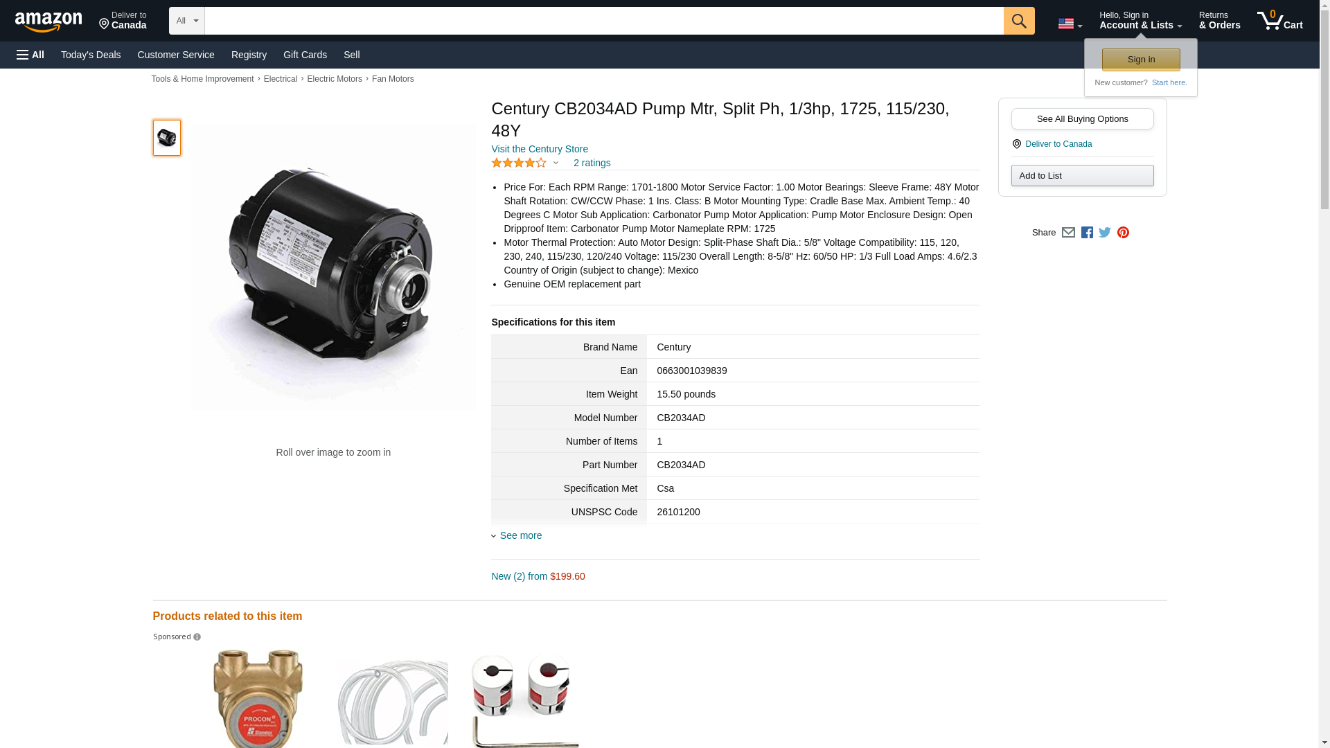 Century CB2034AD Pump Mtr, Split Ph, 1/3hp, 1725, 115/230, 48Y