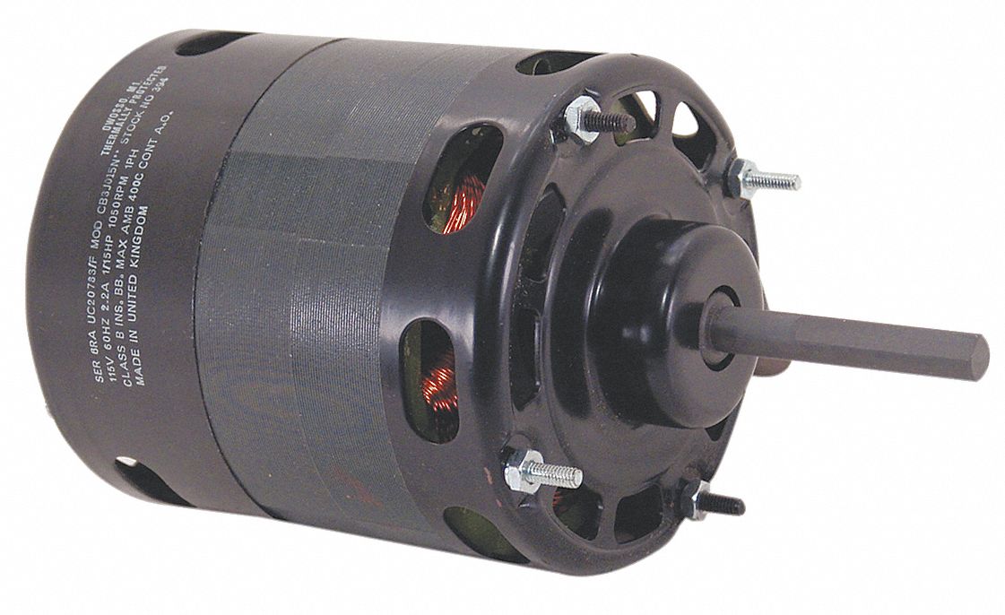 'OEM Replacement Motor, Shaded Pole, 1/15 HP, Nameplate RPM 1050, Voltage 115, Frame 4.3, Open Air-Over, Full Load Amps 2.2, 60 Hz, Stud Motor Mounting Type, Motor Thermal Protection Auto, Ins. Class B, Motor Service Factor 1.00, Ball Motor Bearings, Max. Ambient Temp. 40 Degrees C, Motor Shaft Rotation CWSE, Overall Length 8-5/8 In., Shaft Dia. 3/8 In., Shaft Length 3 In., Capacitor Required No'