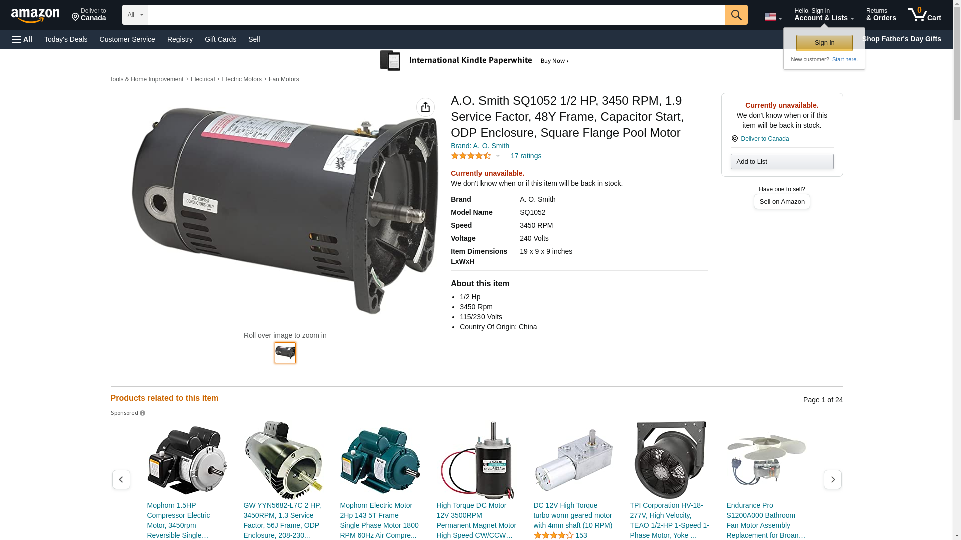 The 1/2 HP Single Phase Motor 3450 115/230 13.4/6.7 60H 48Y is manufactured by AO Smith and has the part number of SQ1052 / SQ1052