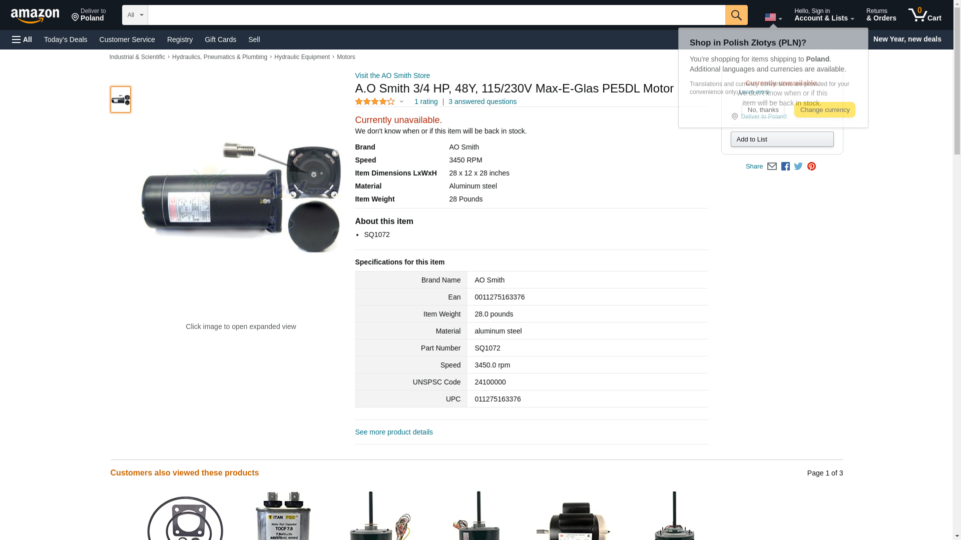 The AO Smith SQ1072 Pool Pump Motor is a Full Rated Square Flange style motor with a 48Y Frame and is a 115V/230V 3/4 Horsepower Motor. Square Flange motors have a square "face" where the motor mounts to the pump with 4 non-threaded bolt holes to attach the pump and a threaded shaft.Features:3/4 HP - Full Rated115/230 Volts14.8/7.4 ampsService Factor: 1.6548Y Frame48Y motor body diameter is 1/2" smaller than 56YSquare Flange (Face)5/8" Threaded ShaftAll copper windings