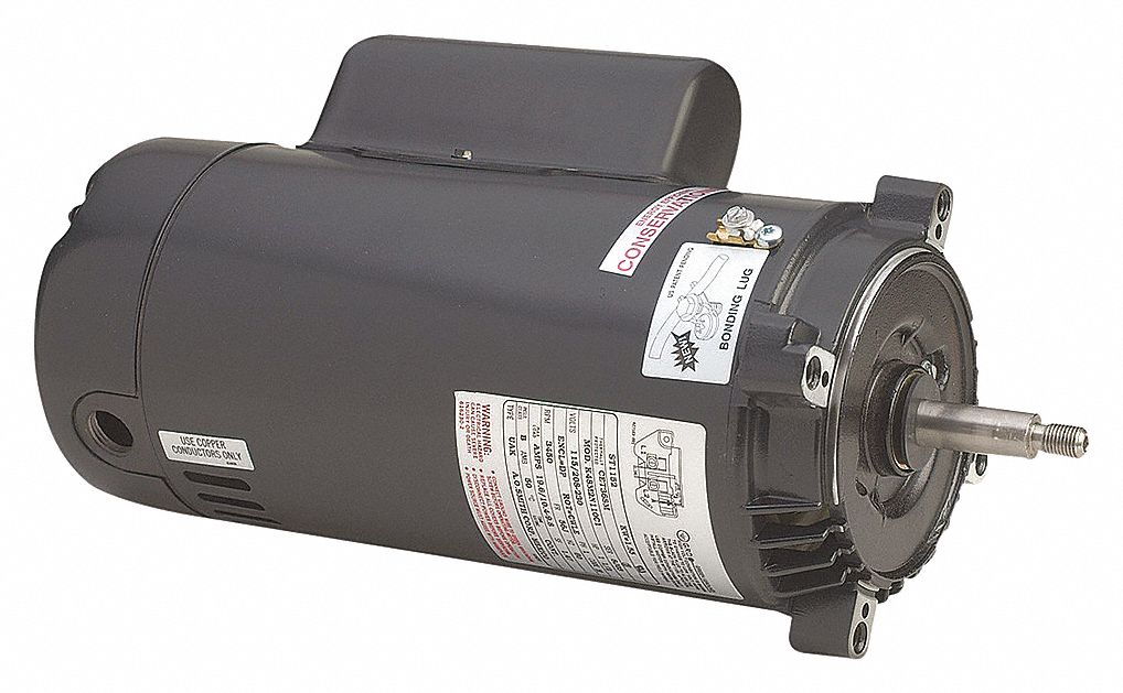 Pool Pump Motor, Single Phase, Motor Design Capacitor-Start/Run, 2 HP, Nameplate RPM 3,450, No. of Speeds 1, Voltage 115/208-230V AC, Full Load Amps 19.6/10.4-9.8, 56J Frame, Usable @ 208V Yes, Usable @ 200V No, 60 Hz, Motor Service Factor 1, Motor Thermal Protection Auto, Ins. Class B, Max. Ambient Temp. 50 Degrees C, Duty Cycle Continuous, Motor Shaft Rotation CCWSE, Motor Enclosure Design Open Dripproof, Motor Mounting Type Face, Motor Mounting Position Horizontal