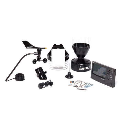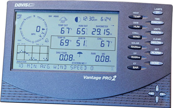 The cabled model includes a console, AC-power adapter, integrated sensor suite with 40' (12m) anemometer cable, mounting hardware, and a 100' (30m) cable connecting the console to the integrated sensor suite.Provides detailed current weather conditions and expanded forecasts - all at a glance! The Vantage Pro2 uses a frequency-hopping spread spectrum radio from 902 MHz to 928 MHz to transmit and receive data up to 1,000' (300m) line of sight. In addition, the weather station features a bubble level, improved anemometer base, redesigned wind cups, and factory-calibrated wind direction. The integrated sensor suite combines temperature and humidity sensors, rain collector with an aluminum-plated tipping bucket, and anemometer into one package for easy setup. Measure inside and outside temperature and humidity, heat index, barometric pressure, dew point, rainfall, wind direction and speed, and wind chill. Use the buttons on the weather station's console to easily navigate through often-used functions. One portion of the 3-1/2" x 6" LCD display provides the most important weather variables at all times. A variable portion of the display allows you to choose what is displayed from several pre-determined options. View over 80 graphs, including in-depth analysis of temperature, rain, rain rate, wind, and barometric pressure. Forecast icons let you know what type of weather to expect, and a ticker-tape display provides expanded forecast details. Use the optional solar radiation sensor to measure solar radiation and monitor evapotranspiration (along with an anemometer and temperature/humidity sensor). WeatherLink for Vantage Pro2 software (sold separately) allows you to collect, analyze, and display weather data and transfer data to your PC. The optional Agricultural/Turf Management Software Module (sold separately) provides specialized reports for farmers, growers, and turf managers according to the individual's needs with a user-defined 24-hour period and growing seaso