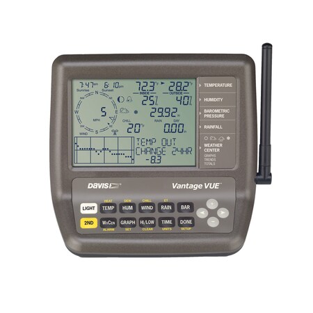 Vantage Vue Wireless Console/ReceiverThe console of the Vantage Vue wireless weather station displays and records your station's weather data, provides graph and alarm functions, and interfaces to a computer using the optional WeatherLink software.The Vantage Vue station also includes an outdoor Integrated Sensor Suite (ISS) that transmits outside sensor data to the console via a low-power radio. The console displays all the information coming from the ISS in an easy-to-use format. It can also receive data from a Davis Vantage Pro2 weather station.The compact console is loaded with features, including a backlit LCD screen and glow-in-the-dark keypad that makes viewing weather data easy, day or night. Unique Weather Center feature allows you to view multiple screens of weather data simply and quickly.Vantage Vue gives you the weather data you need. You'll see current weather conditions, including indoor and outdoor temperature and humidity, barometric pressure, wind speed and direction, dew point and rainfall. You'll also get weather forecast icons, moon phase, sunrise/sunset times, graphing of weather trends, alarms and more. Vantage Vue also boasts the unique Weather Center button that displays additional data on weather variables for today and over the last 25 days.Time & Date View the current time and date or time of sunrise/sunset.Moon PhaseSee the eight phases of the moon from new to full.Forecast IconsIcons let you know to expect sun, part sun, clouds, rain, or snow.Temperature & HumidityConsole updates outside temperature every 10 seconds and inside temperature every minute. In addition, outside humidity Updates every 50 seconds and inside humidity every minute.RetransmitsMain console can extend range to additional consoles up to 1,000 ft. (300 m).br