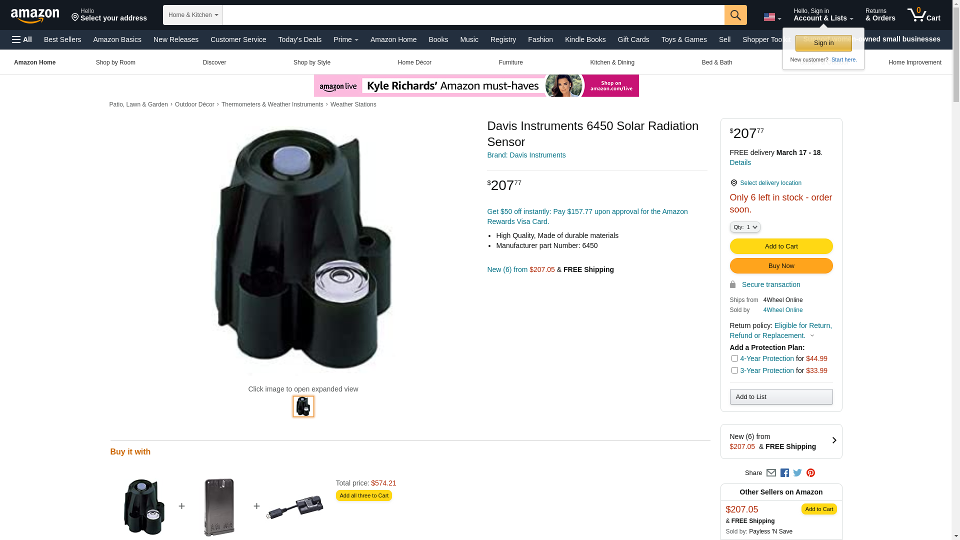 For use with Vantage Pro and Vantage Pro2. (Already included with Vantage Pro Plus and Vantage Pro2 Plus.) Measures solar radiation and is required (along with an anemometer and a temperature/humidity sensor) if you wish to monitor evapotranspiration. Diffuser element and housing are carefully designed for accurate cosine response. Silicon photo diode provides good match to solar spectrum. Two-piece housing minimizes radiation heating, allows convection cooling of the sensor, and prevents the trapping of water or dust. Includes built-in level and 2' (0.6 m) cable. Compatible with both original Vantage Pro and Vantage Pro2. You may also need a UV Sensor (#6490) and Sensor Mounting Shelf (#6673).X