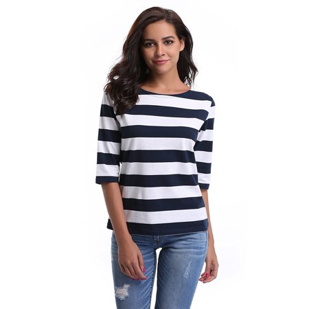 MISS MOLY Women Contrast Blue Striped T-shirt 3/5 Sleeve Shirt Blouse Top Tee M