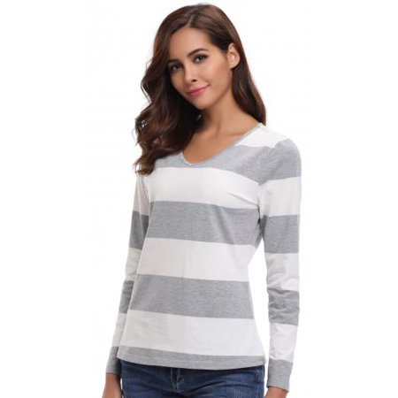 <li>1. Material:95% COTTON,5% SPANDEX; Light Weight, Breathable and Comfortable for Daily Wearing and Hang Out;</li> <li>2. Easy Matching with Jeans etc,. and Casual Stylish; Striped Long Sleeves</li> <li>3. Fashion Striped Light Gray and White Designed; V Neck; Excellent Product Quality</li> <li>4.MISS MOLY HOT SALE! Please refer to our <b>SIZE Chart</b> from the description.</li> <li>5. Model Body Size: Height: 5'7", Chest: 34 1/2 inches, Waist: 24 1/2 inches, Hip: 35 3/4 inches</li>