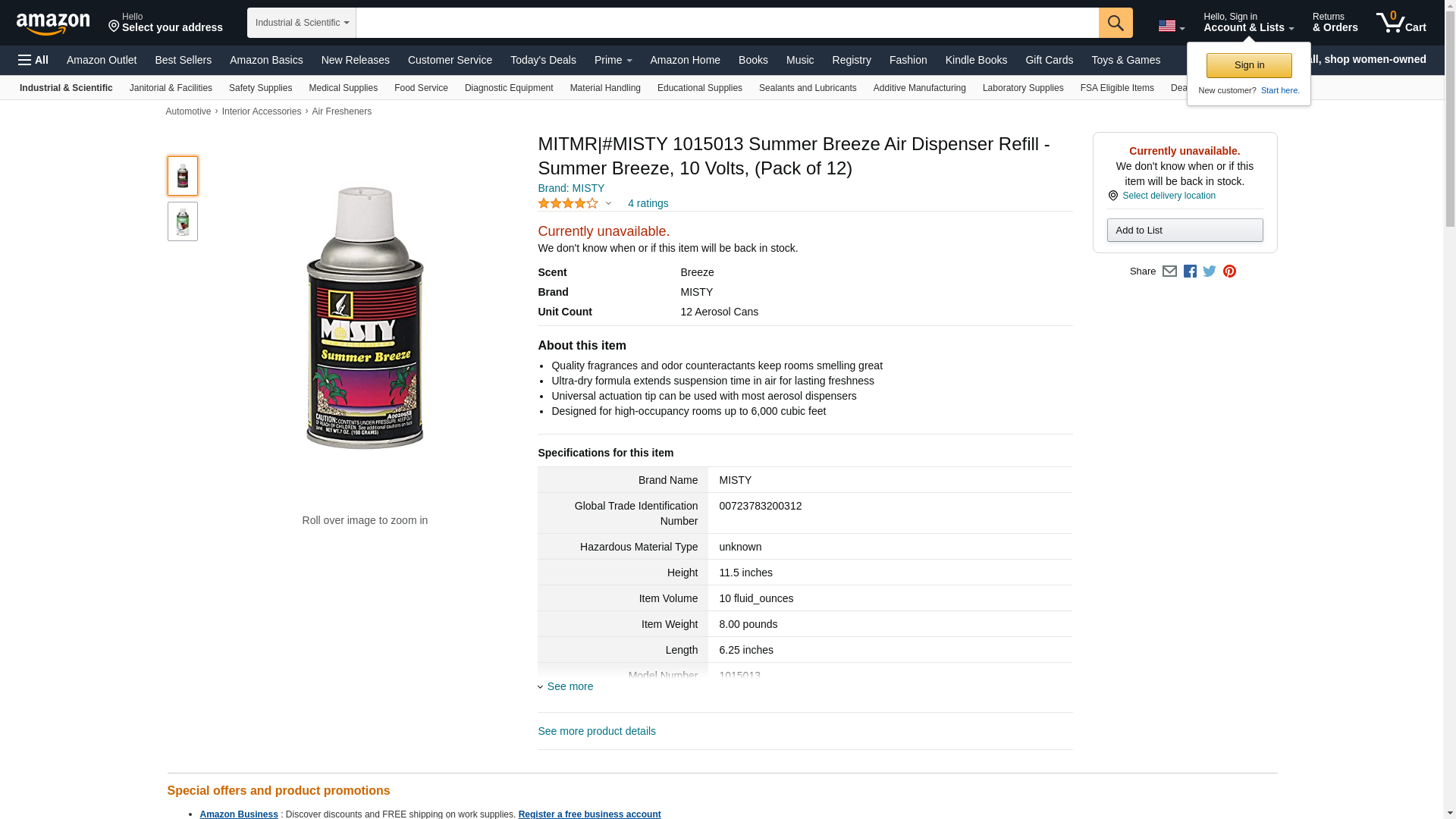Misty METERED Dry Deodorizer Refills, Summer Breeze, 7 OZ AEROSOL, 12/Carton