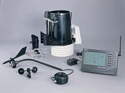 Cabled Vantage Pro2 Plus w/ Standard Radiation ShieldIncludes Vantage Pro2 console, integrated sensor suite, mounting hardware, and AC-power adapter. Integrated sensor suite includes rain collector, temperature and humidity sensors, anemometer, 40' (12 m) anemometer cable, solar radiation sensor, UV sensor, and sensor mounting shelf. A 100' (30 m) cable connects the sensor suite to the console.Temperature and humidity sensors are enclosed in standard radiation shield.