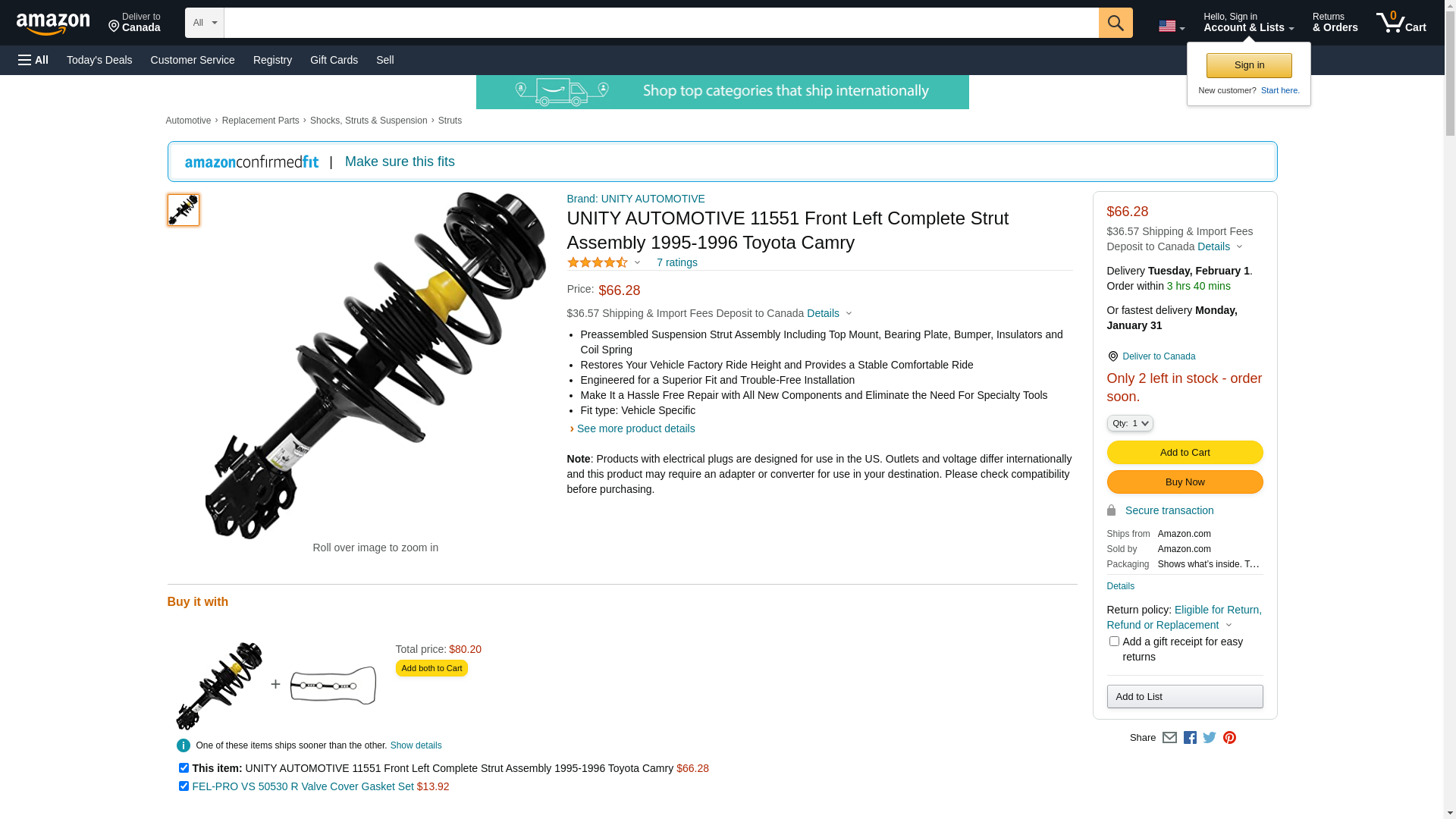 UNITY AUTOMOTIVE 11551 Front Left Complete Strut Assembly 1995-1996 Toyota Camry