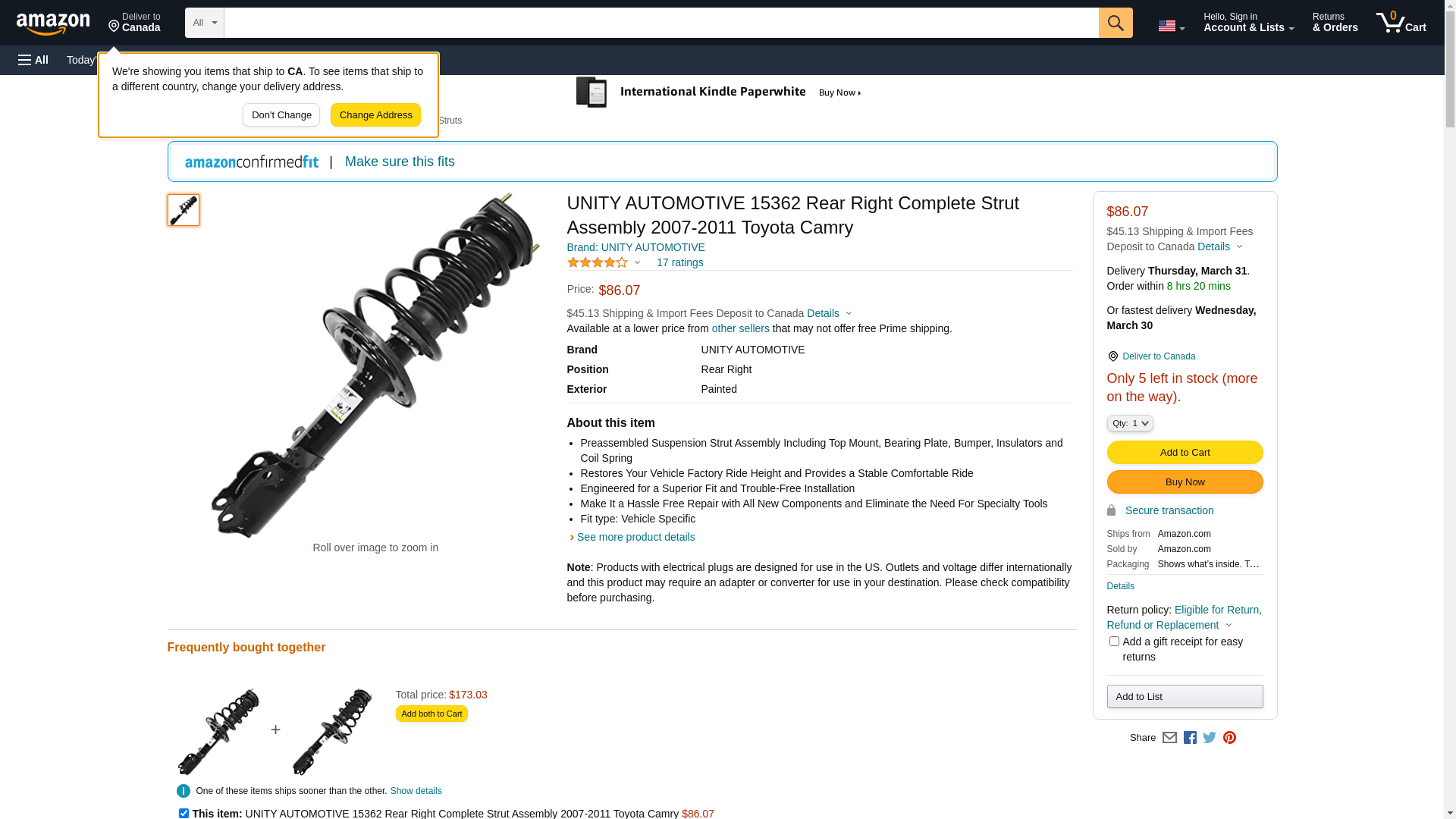 UNITY AUTOMOTIVE 15362 Rear Right Complete Strut Assembly 2007-2011 Toyota Camry
