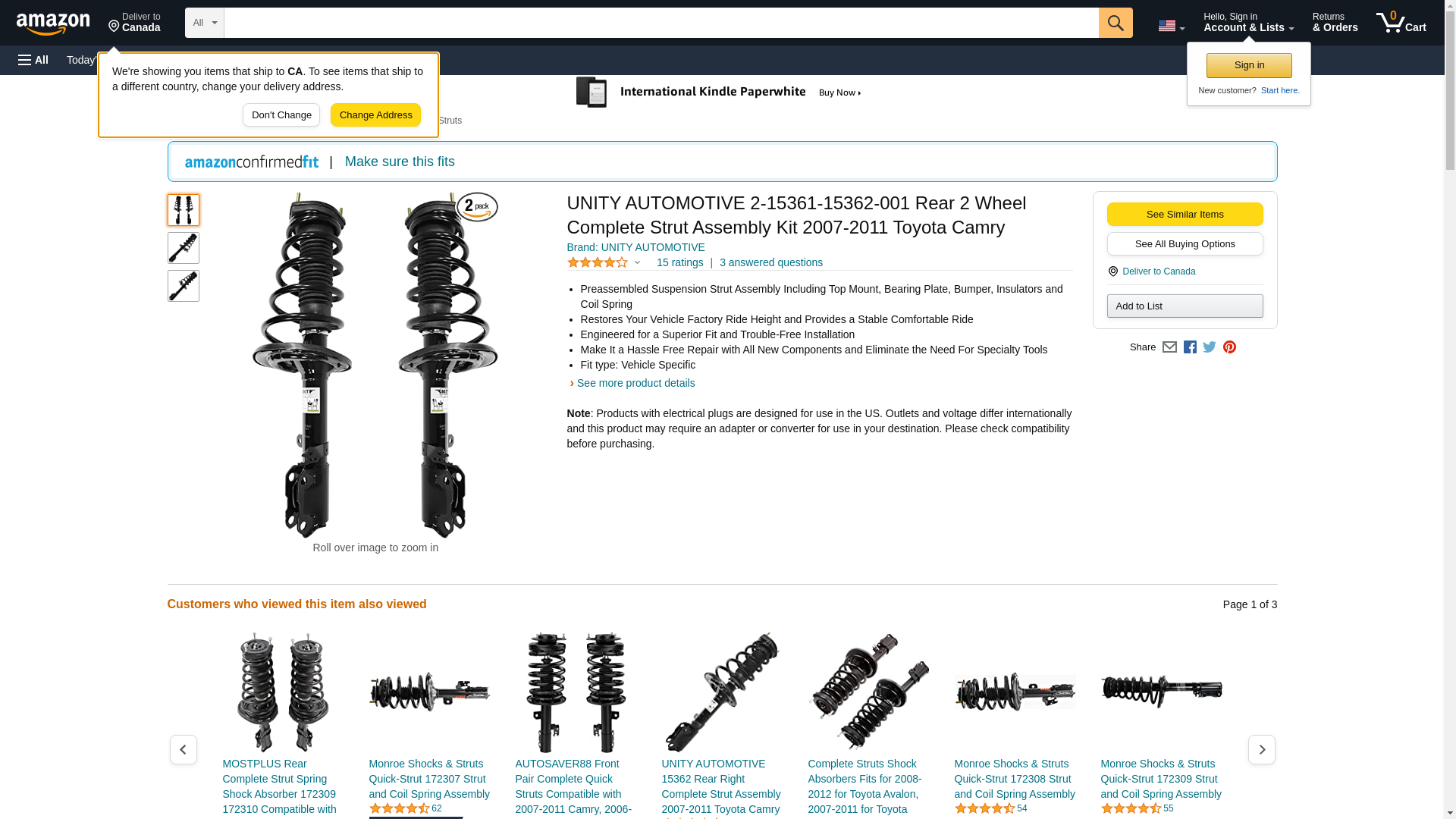 UNITY AUTOMOTIVE 2-15361-15362-001 Rear 2 Wheel Complete Strut Assembly Kit 2007-2011 Toyota Camry