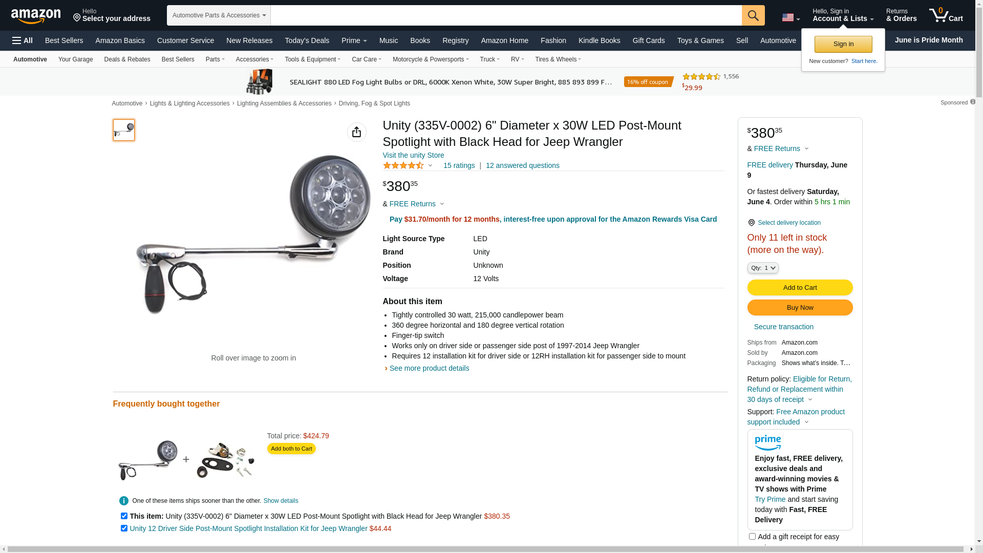 Unity (335V-0002) 6" Diameter x 30W LED Post-Mount Spotlight with Black Head for Jeep Wrangler