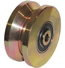 Power Wheels are the finest choice available for high-traffic, commercial sliding gates track applications. Cold roll steel V-Groove wheel. Hub width 2" Designed to be maintenance free. Gold Zinc Plated with Sealed Ball Bearings. two 2" sealed bearings with 1" axle -.5"x3.25" bolt with nut- 4"h x 1.75"w -3,000 lbs