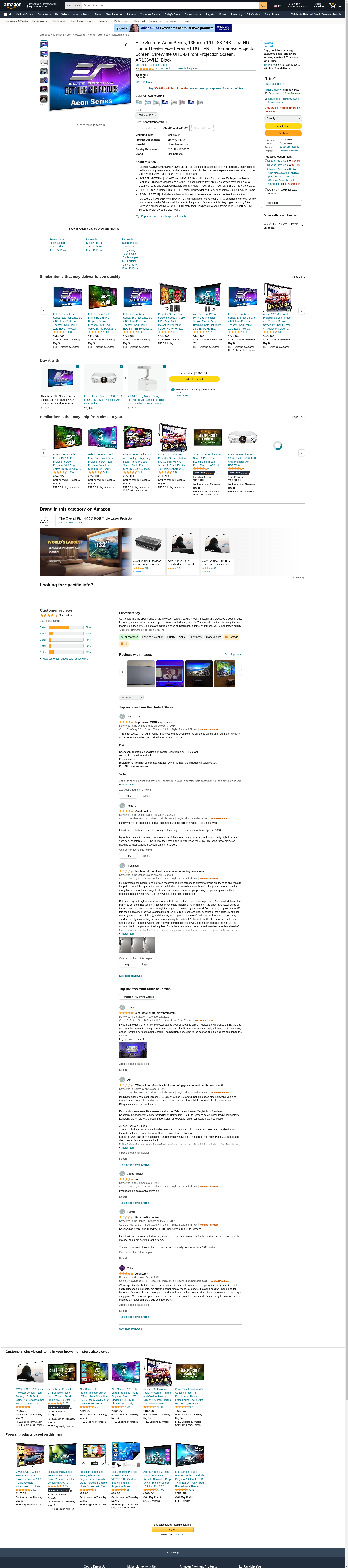 Elite Screens Aeon Series, 135-inch 16:9, 8K / 4K Ultra HD Home Theater Fixed Frame EDGE FREE Borderless Projector Screen, CineWhite UHD-B Front Projection Screen, AR135WH2, Black