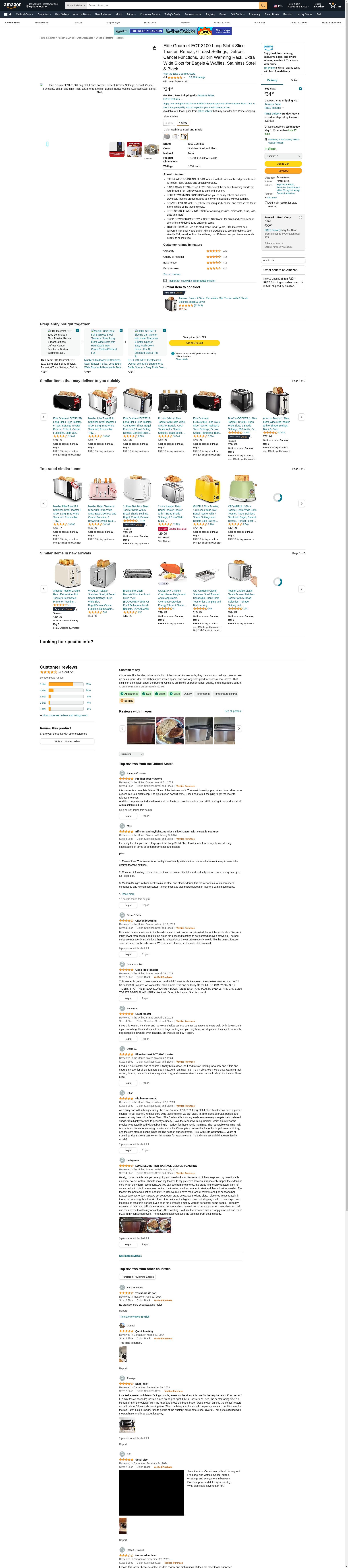 Elite Gourmet ECT-3100 Long Slot 4 Slice Toaster, Reheat, 6 Toast Settings, Defrost, Cancel Functions, Built-in Warming Rack, Extra Wide Slots for Bagels & Waffles, Stainless Steel & Black