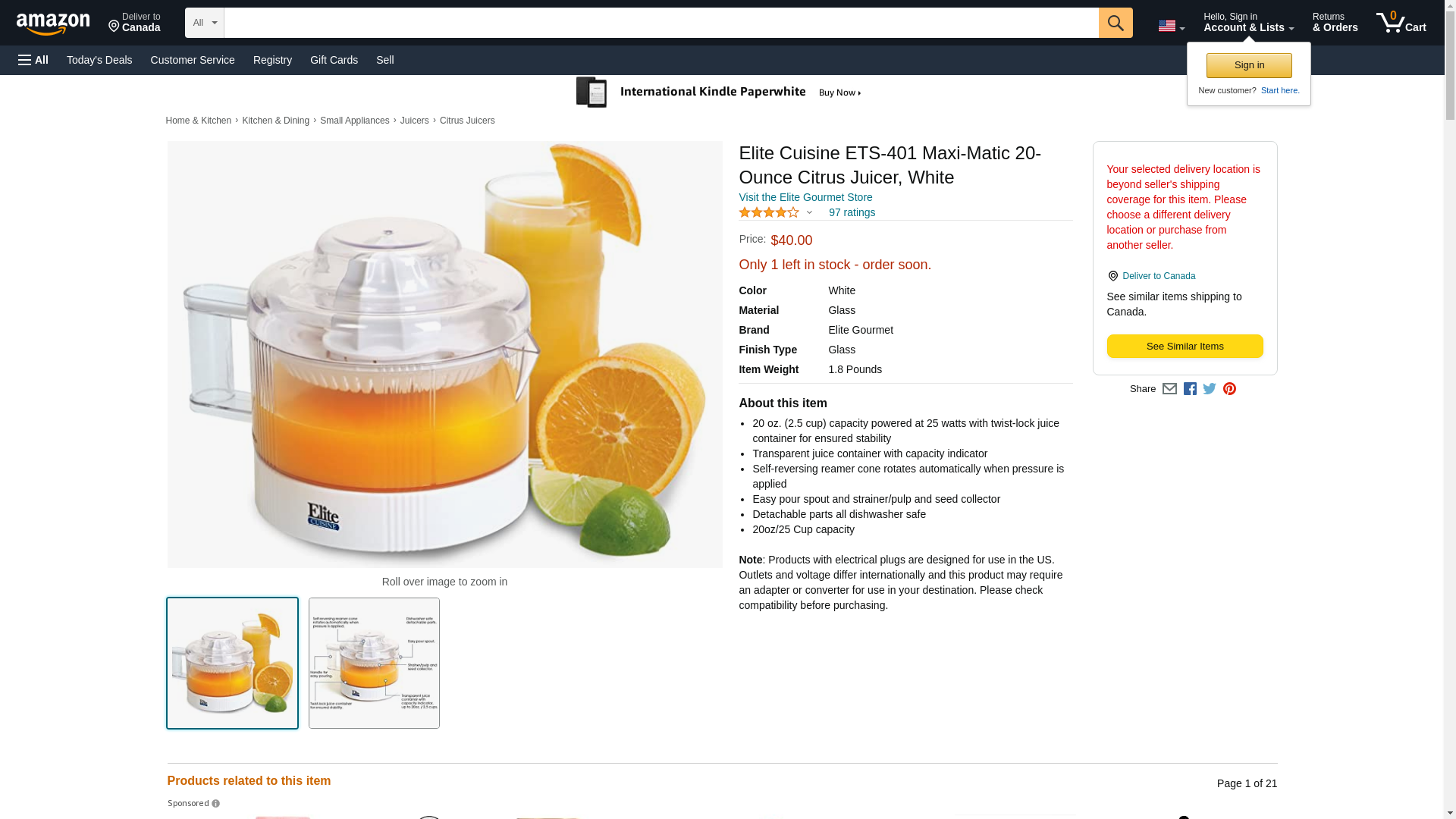 Elite Cuisine ETS-401 Maxi-Matic 20-Ounce Citrus Juicer, White