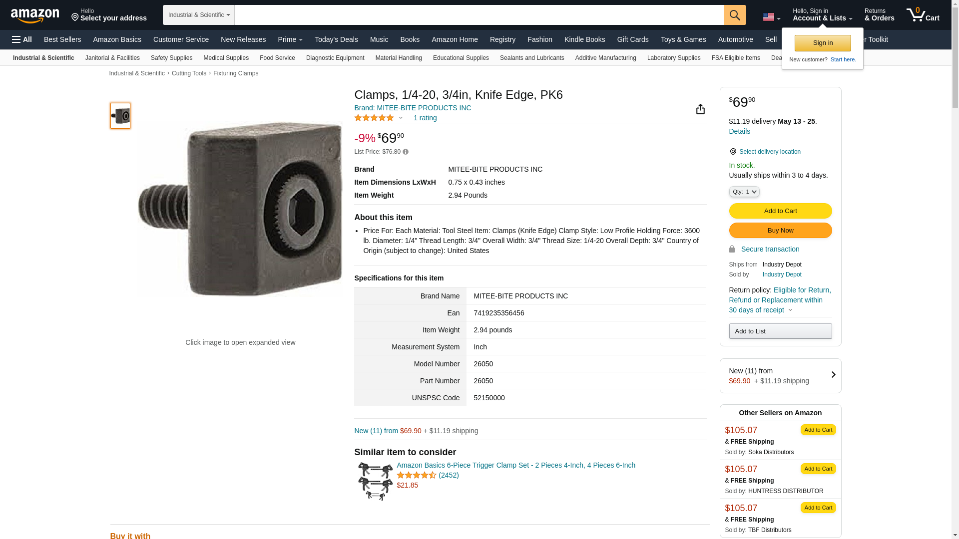 | Feature | Price For: Each Material: Tool Steel Item: Clamps (Knife Edge) Clamp Style: Low Profile Holding Force: 3600 lb. Diameter: 1/4" Thread Length: 3/4" Overall Width: 3/4" Thread Size: 1/4-20 Overall Depth: 3/4" Country of Origin (subject to change): United States |