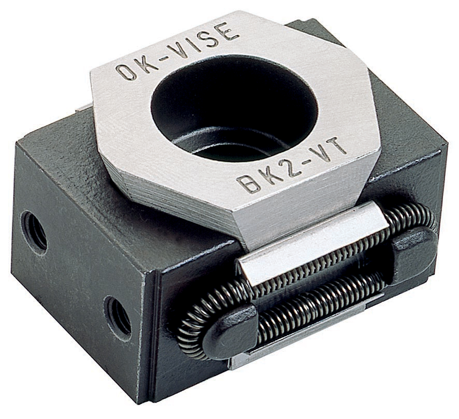 Mitee-Bite? OK-Vise? Clamp BK2-VT-T Single Wedge, Tapped Both Jaws, 5/16-18 Screw, 5,000 lbf Holding Force. This model comes with M5 tapped holes in each jaw,?making it quick and easy to use various additional pieces, which can be machined into different shapes. OK-VISE low-profile clamps expand when they are tightened down, simultaneously pressing the workpieces against the guide and preventing their movement. They are designed to take up very little space on the fastening base. Small in size, yet with an excellent clamping force, these clamps guarantee a holding capacity that clearly exceeds the load of machining forces.?Fastening with only one bolt ensures quick set-up times. Mitee-Bite? Part #47112