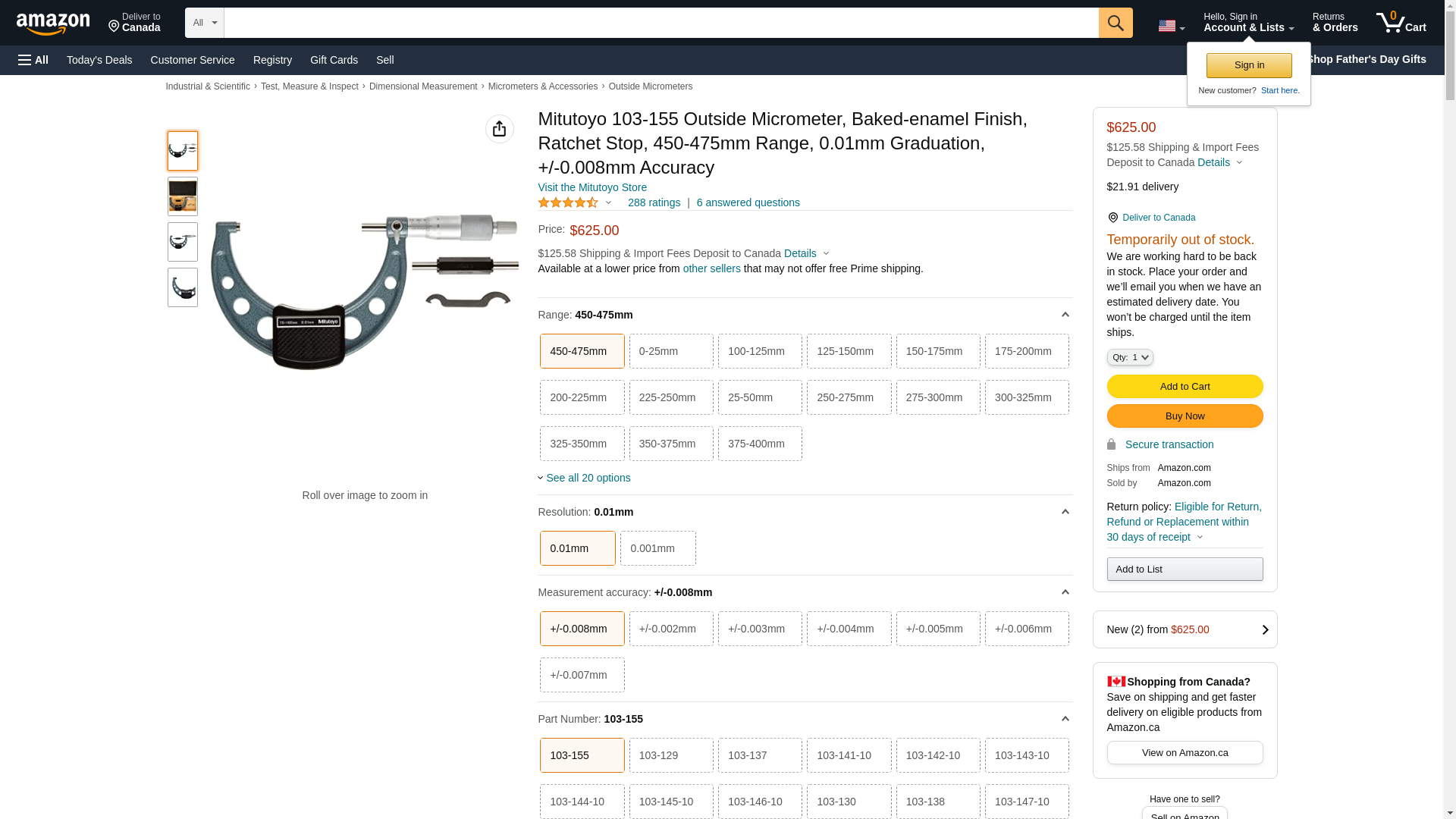 Mitutoyo 103-155 Outside Micrometer, Baked-enamel Finish, Ratchet Stop, 450-475mm Range, 0.01mm Graduation, +/-0.008mm Accuracy