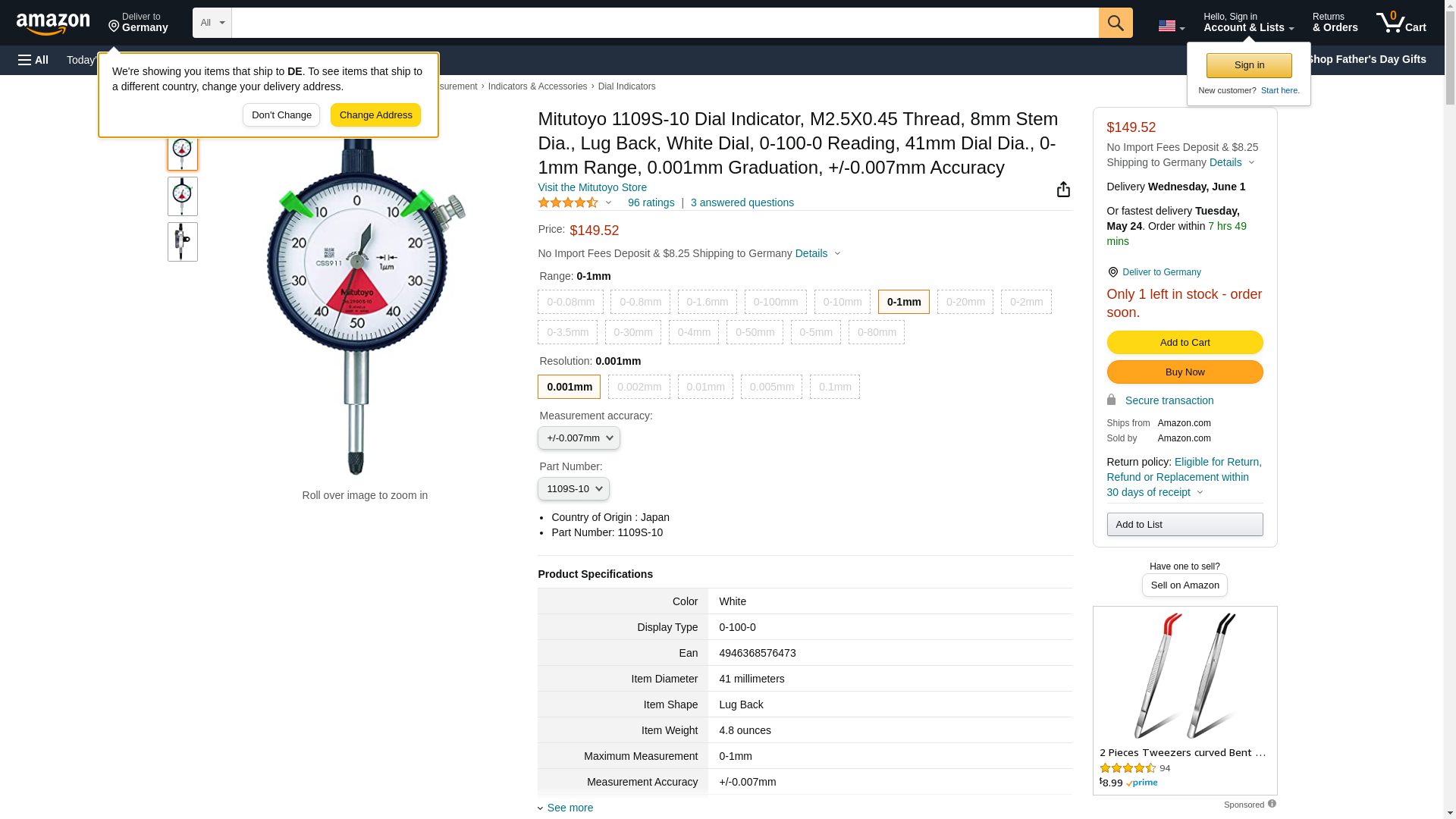 Mitutoyo 1109S-10 Dial Indicator, M2.5X0.45 Thread, 8mm Stem Dia., Lug Back, White Dial, 0-100-0 Reading, 41mm Dial Dia., 0-1mm Range, 0.001mm Graduation, +/-0.007mm Accuracy