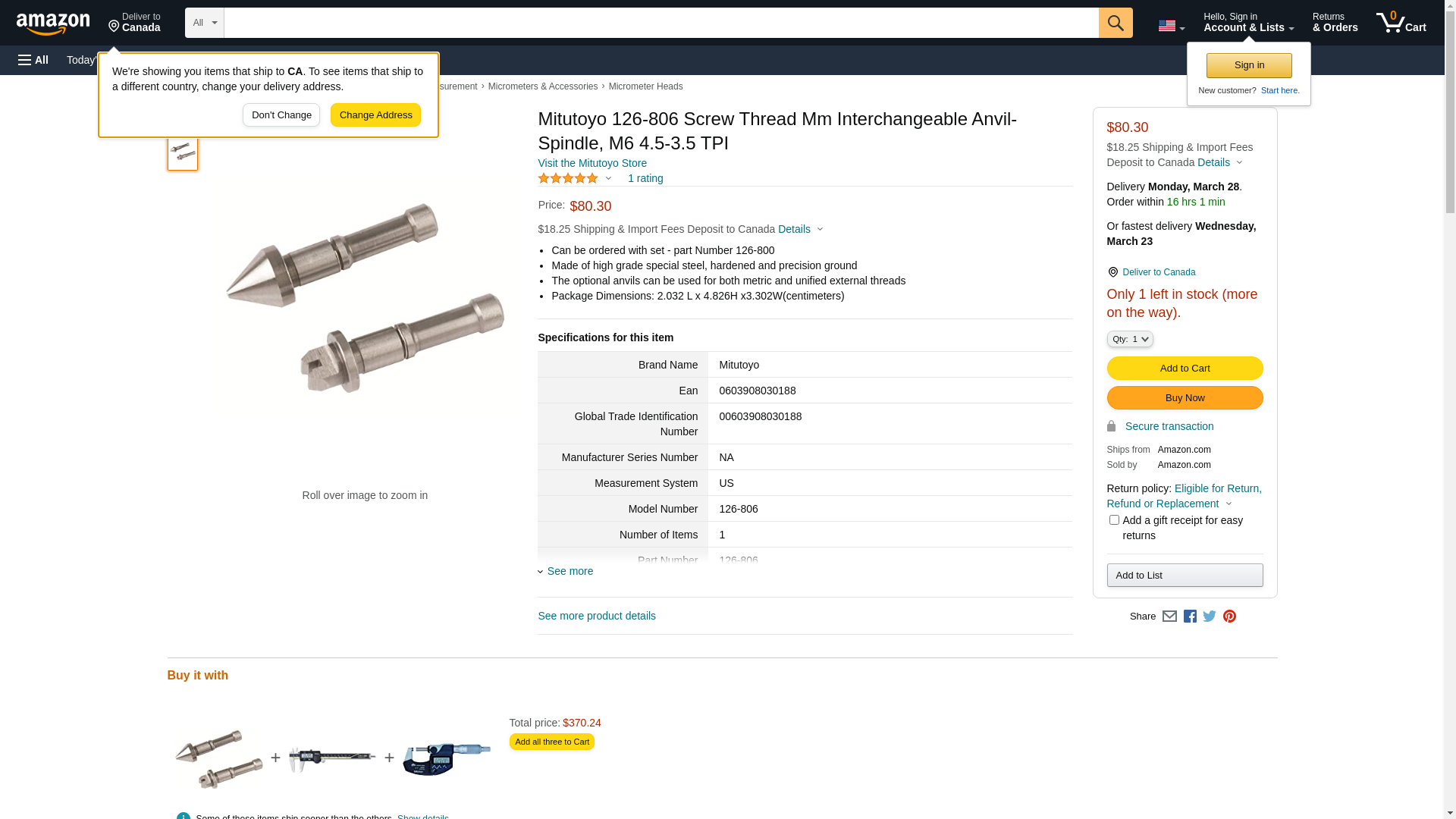 Mitutoyo 126-806 Screw Thread Μm Interchangeable Anvil-Spindle, M6 4.5-3.5 TPI