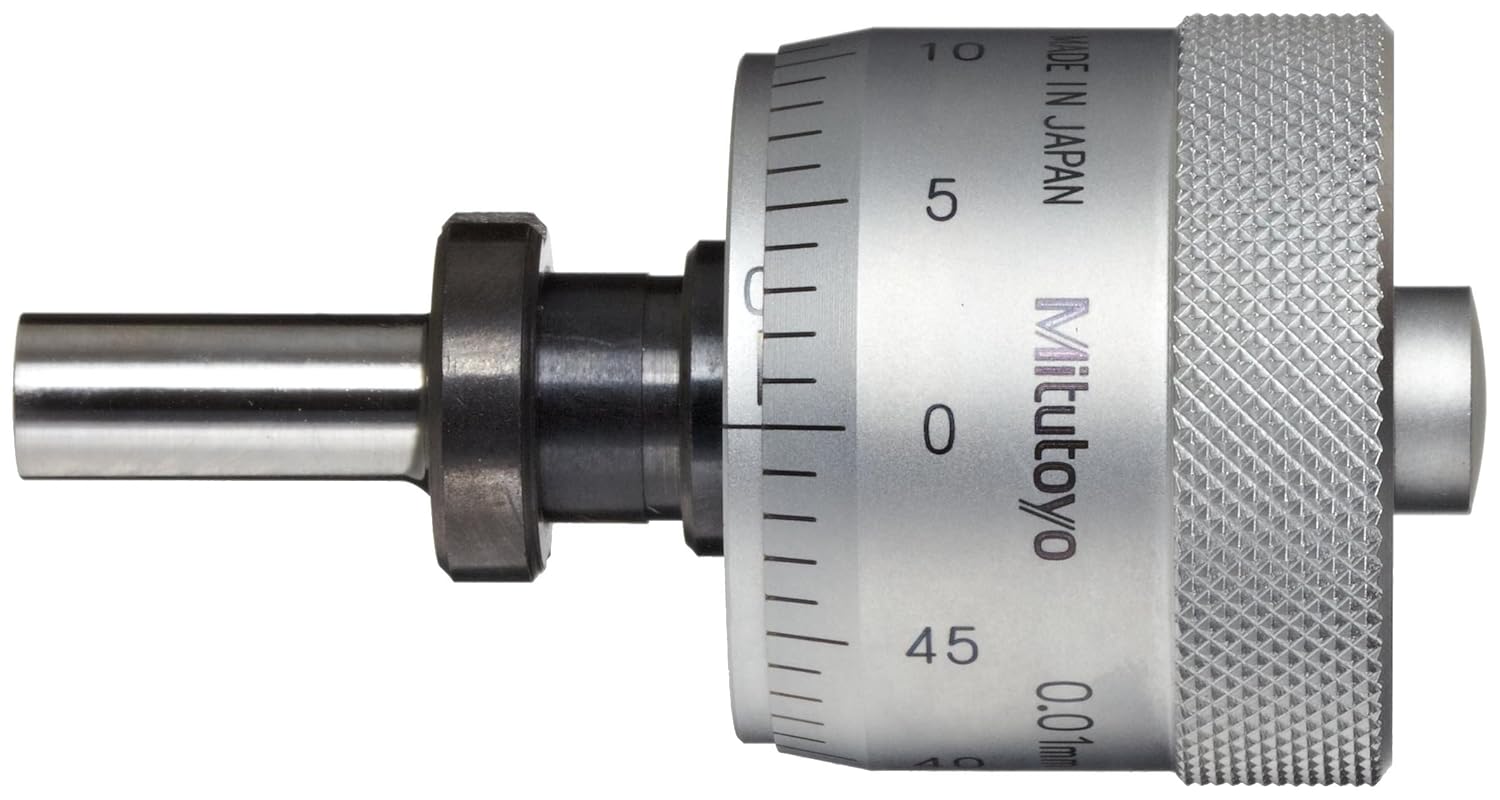 Mitutoyo 148-302 Large Micrometer Head, 0-6.5mm Range, 0.01mm Graduation, +/-0.002mm Accuracy, Plain Thimble, Clamp Nut, Flat Face, 15mm Thimble Dia.