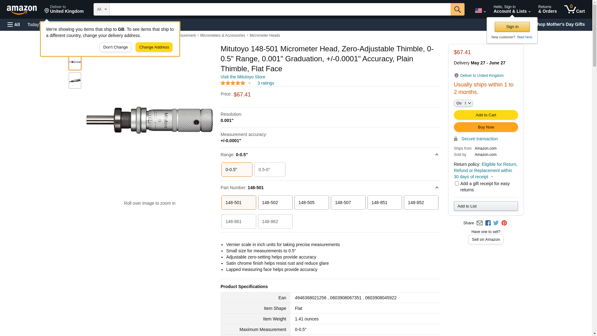 Mitutoyo 148-501 Micrometer Head, Zero-Adjustable Thimble, 0-0.5" Range, 0.001" Graduation, +/-0.0001" Accuracy, Plain Thimble, Flat Face