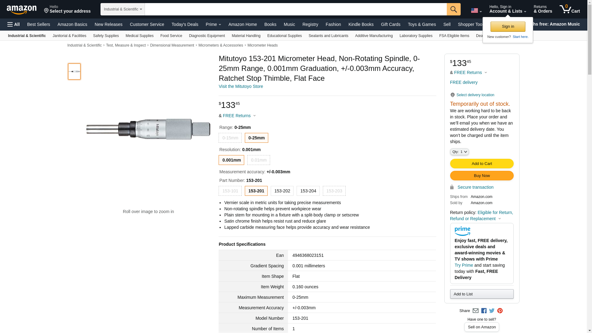 Mitutoyo 153-201 Micrometer Head, Non-Rotating Spindle, 0-25mm Range, 0.001mm Graduation, +/-0.003mm Accuracy, Ratchet Stop Thimble, Flat Face