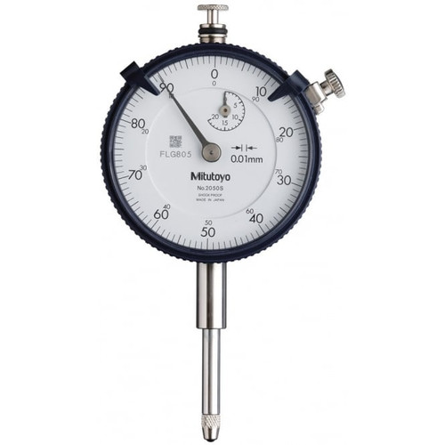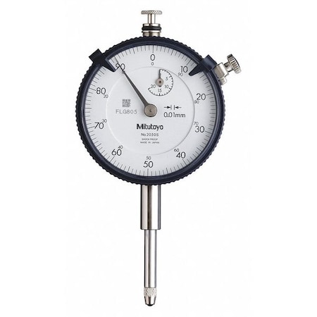 Mitutoyo 2050S Dial Indicator, M2.5X0.45 Thread, 8mm Stem Dia., Lug Back, White Dial, 0-100 Reading, 57mm Dial Dia., 0-20mm Range, 0.01mm Graduation, +/-0.02mm Accuracy