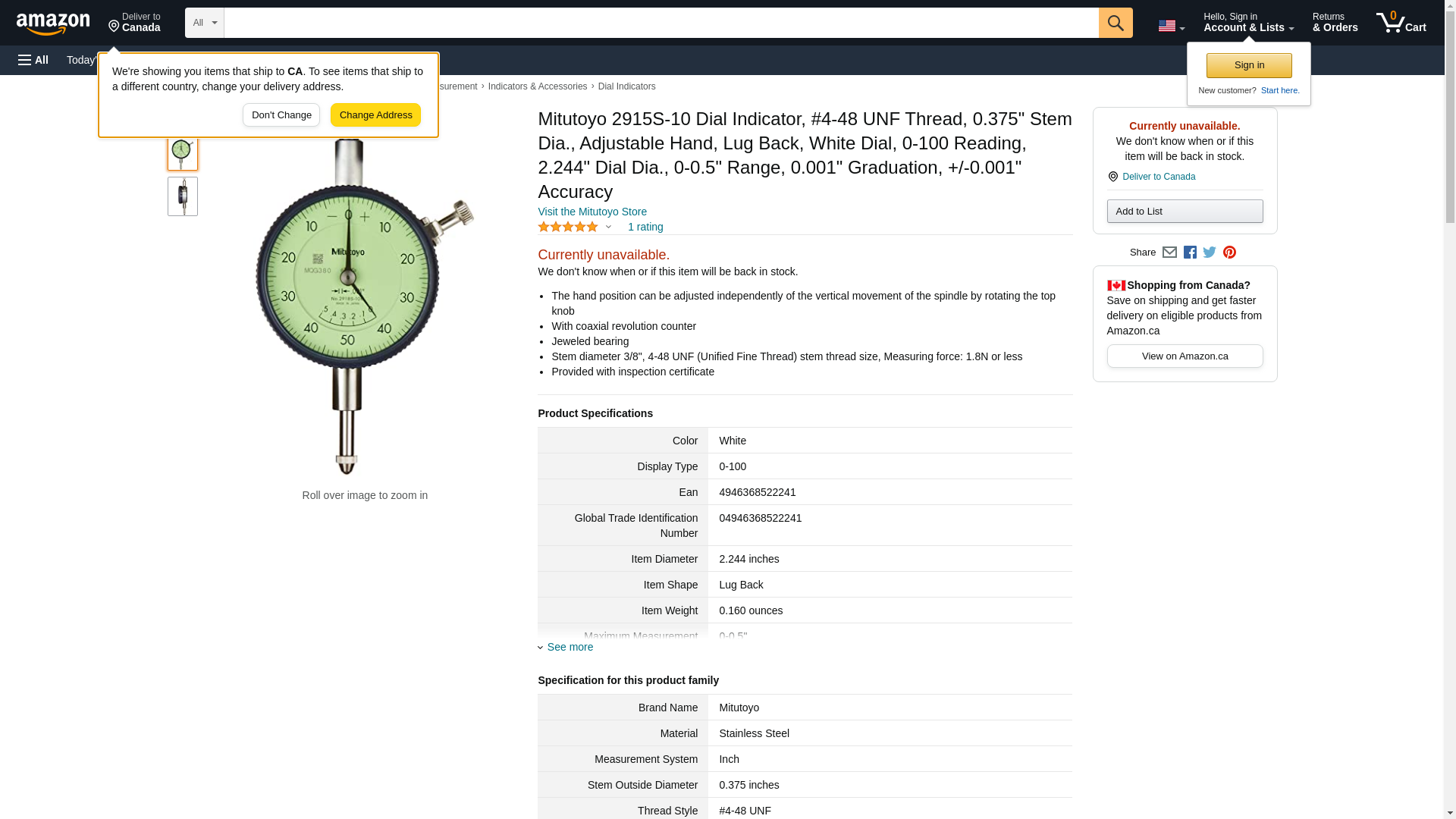 Mitutoyo 2915S-10 Dial Indicator, #4-48 UNF Thread, 0.375" Stem Dia., Adjustable Hand, Lug Back, White Dial, 0-100 Reading, 2.244" Dial Dia., 0-0.5" Range, 0.001" Graduation, +/-0.001" Accuracy