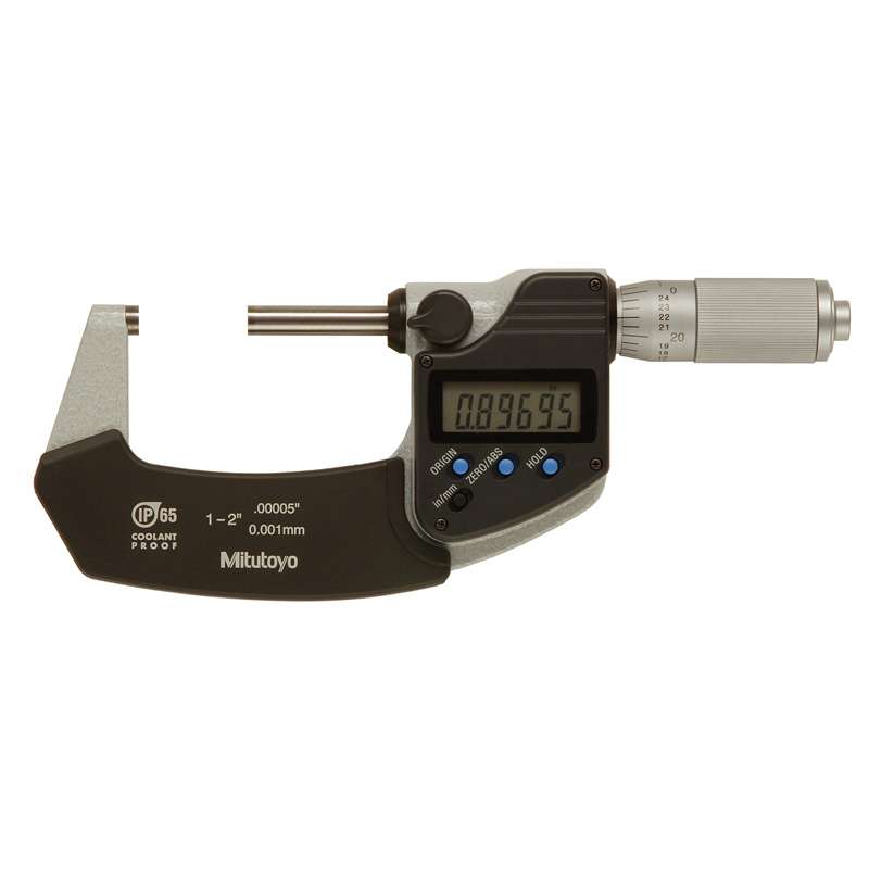 Mitutoyo 293-345 Digital Outside Micrometer, Inch/Metric, Ratchet Thimble, 1-2" (25.4-50.8mm) Range, 0.00005" (0.001mm) Resolution, +/-0.00005" Accuracy, Meets IP65 Specifications