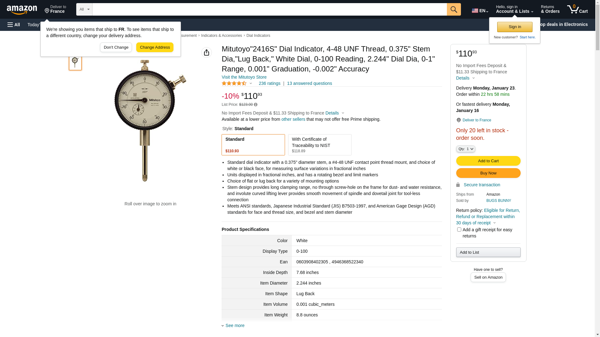 | Feature | Standard dial indicator with a 0.375" diameter stem, a #4-48 UNF contact point thread mount, and choice of white or black face, for measuring surface variations in fractional inches |