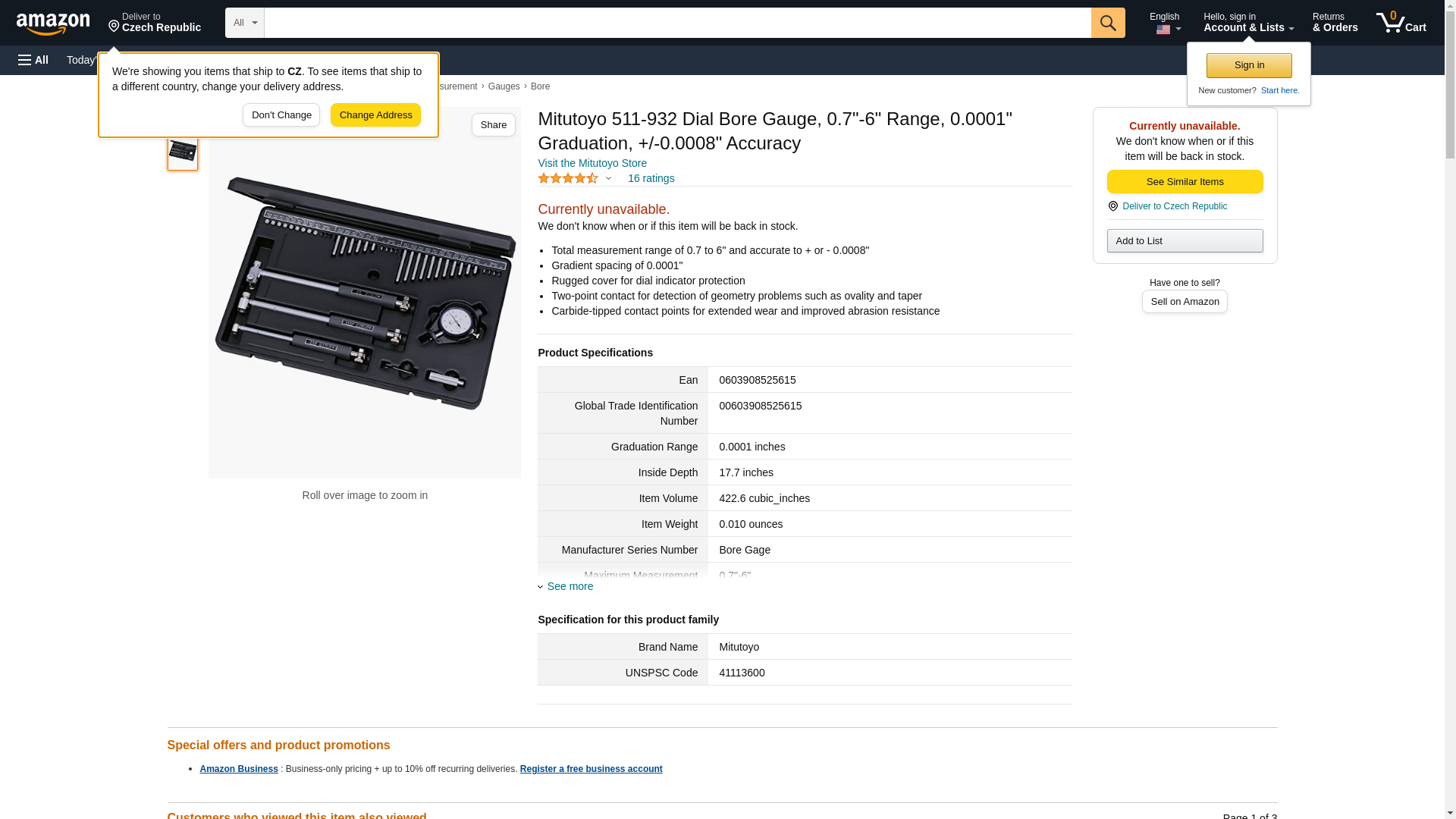 Mitutoyo 511-932 Dial Bore Gauge, 0.7"-6" Range, 0.0001" Graduation, +/-0.0008" Accuracy