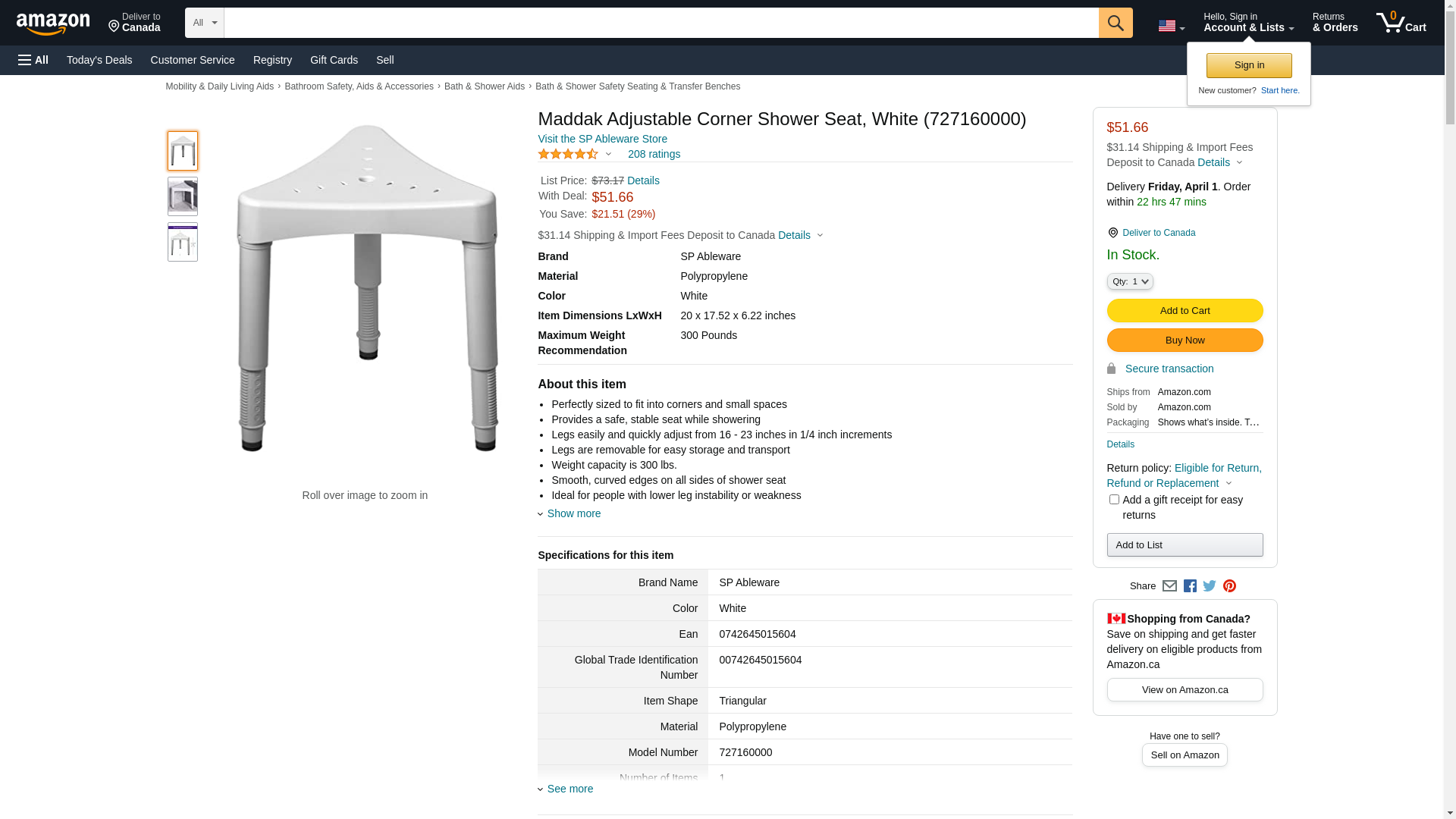 Maddak Adjustable Corner Shower Seat, White (727160000): Maxedbuy.com