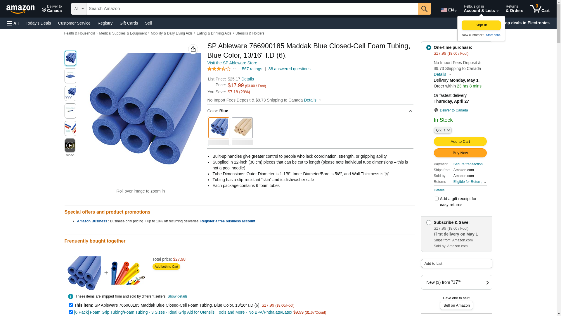 Color: Blue Color: Blue , closed-cell tubing is used to build up handles on items--such as eating or writing utensils, or toothbrushes---for individuals with coordination, strength, or gripping challenges. The tubing has slip-resistant covering for secure grasp, and is non-water absorbent and dishwasher safe for ease of cleaning. Delivered in a pack of six, the tubing can be cut to length for versatile use, and has a 13/16-inch inner diameter and 1-1/8-inch outer diameter, with 0.21 to 0.29-inch wall thickness. Maddak specializes in home healthcare and rehabilitation products for the senior, disability and rehab markets. We have been recognized as the largest manufacturer in the United States of Aids for Daily Living (ADL). Maddak continues to design and manufacture products that increase mobility, maximize independence and enable people to live more rewarding, dignified and enriched lives.