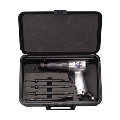 An excellent power-to-weight ratio makes this tool one of the most powerful hammers in the market. This heavy-duty pistol grip hammer has a standard 0.401 round shank for fast action and the ability to withstand rugged use. Attach each chisel to remove rust from mufflers and pipes, cut body panels, and peel off spot welds.This air hammer has a free speed of 3000 BPM with a quick change retainer for quick chisel replacement.The SP-1410K Kit includes an air hammer and four chisels:Tapered Punch Chisel (#812)Flat Chisel (#810)Spot Welder Chisel (#815)Sheet Metal Chisel B (#807)