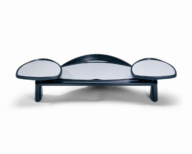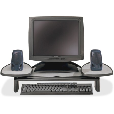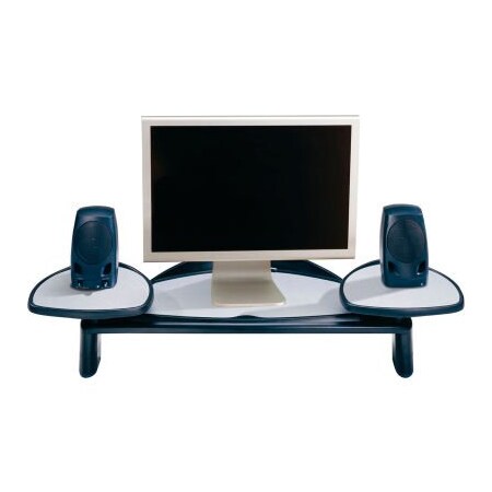 Monitor height adjustment. Two side shelves are also independently adjustable. Accommodates keyboard storage, speakers and cables. Rubber feet and top design prevent slipping. Supports flat-panel monitors up to 21" and 35 lbs.