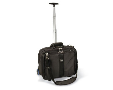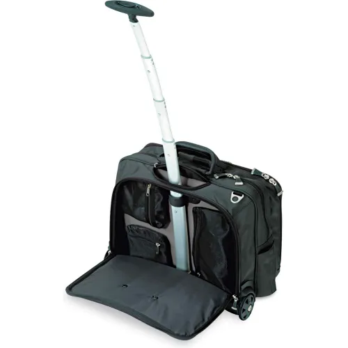 Roller laptop case is an ergonomic contour panel that delivers go-anywhere comfort and protection. SnugFit compartment suspends and wraps laptop for superior protection and security. Five-stage telescopic handle shifts weight onto the wheels for easier roller navigation, while the contour system helps reduce effective case weight by 35% in those circumstances where the case needs to be carried. Outer pockets for water bottle and umbrella and extendable, lightweight single handle. Ballistic nylon protects against abrasions, punctures and tears.