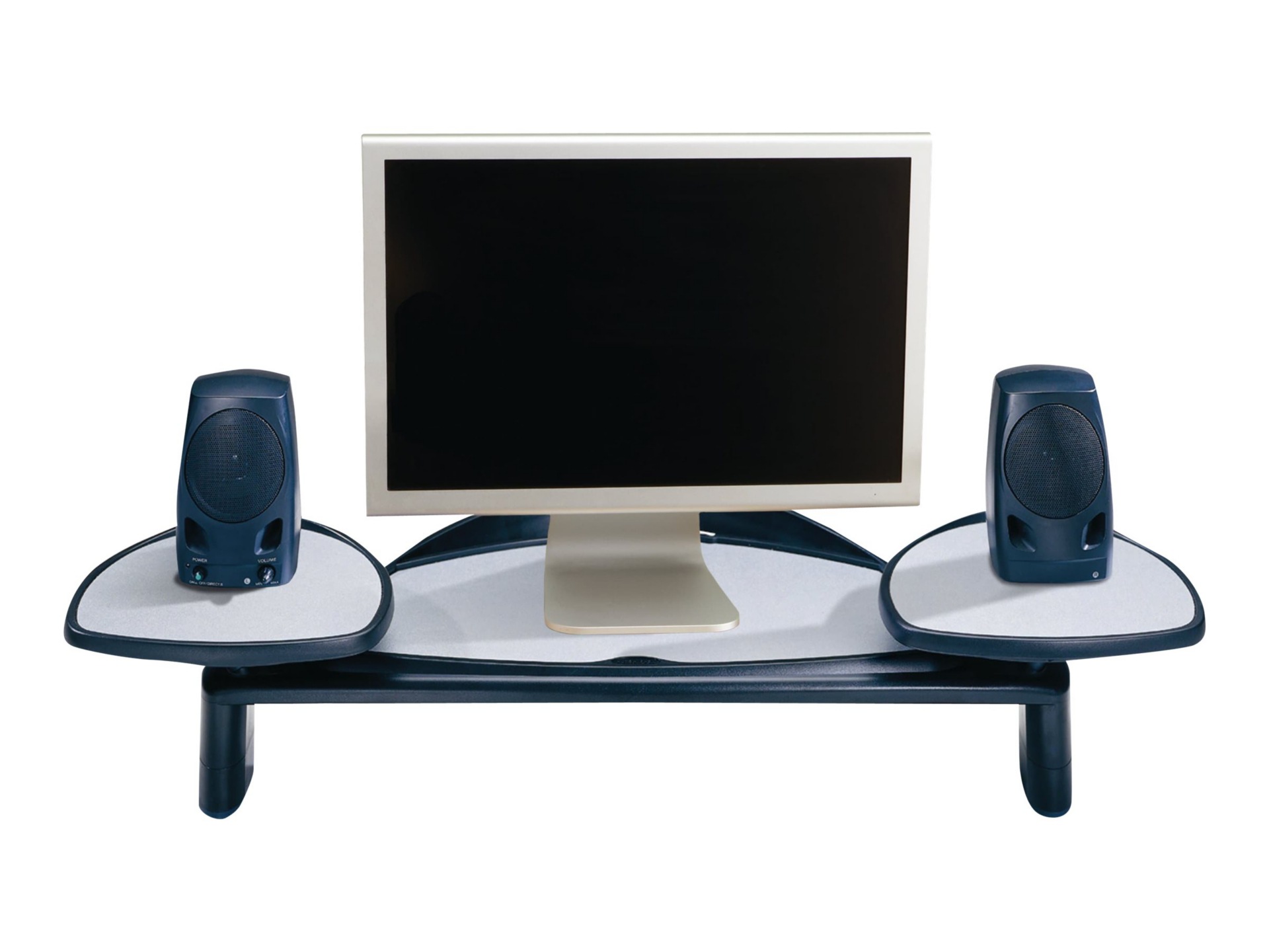 Monitor height adjustment. Two side shelves are also independently adjustable. Accommodates keyboard storage, speakers and cables. Rubber feet and top design prevent slipping. Supports flat-panel monitors up to 21" and 35 lbs.