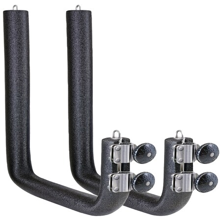 - Each arm has (2) heavy duty stainless steel rail brackets with adjusting knobs, (2) stainless steel tie-down loops, and pre-installed UV resistant protective foam padding