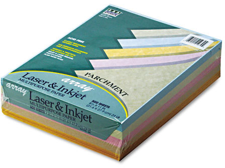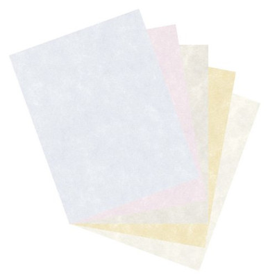 Classic parchment textured paper adds elegance to certificates, awards, invitations, calligraphy, announcements, memory books, rubber stamping, photo albums, cards, report/book covers, presentations and resumes. Works well in laser and inkjet printers, photocopiers and offset printers. 24 lb. Assorted five colors include: Natural, Gold, Tan, Blue and Pink. Acid free and recyclable. Each sheet is 8.5" x 11". Each pack contains 500 sheets.