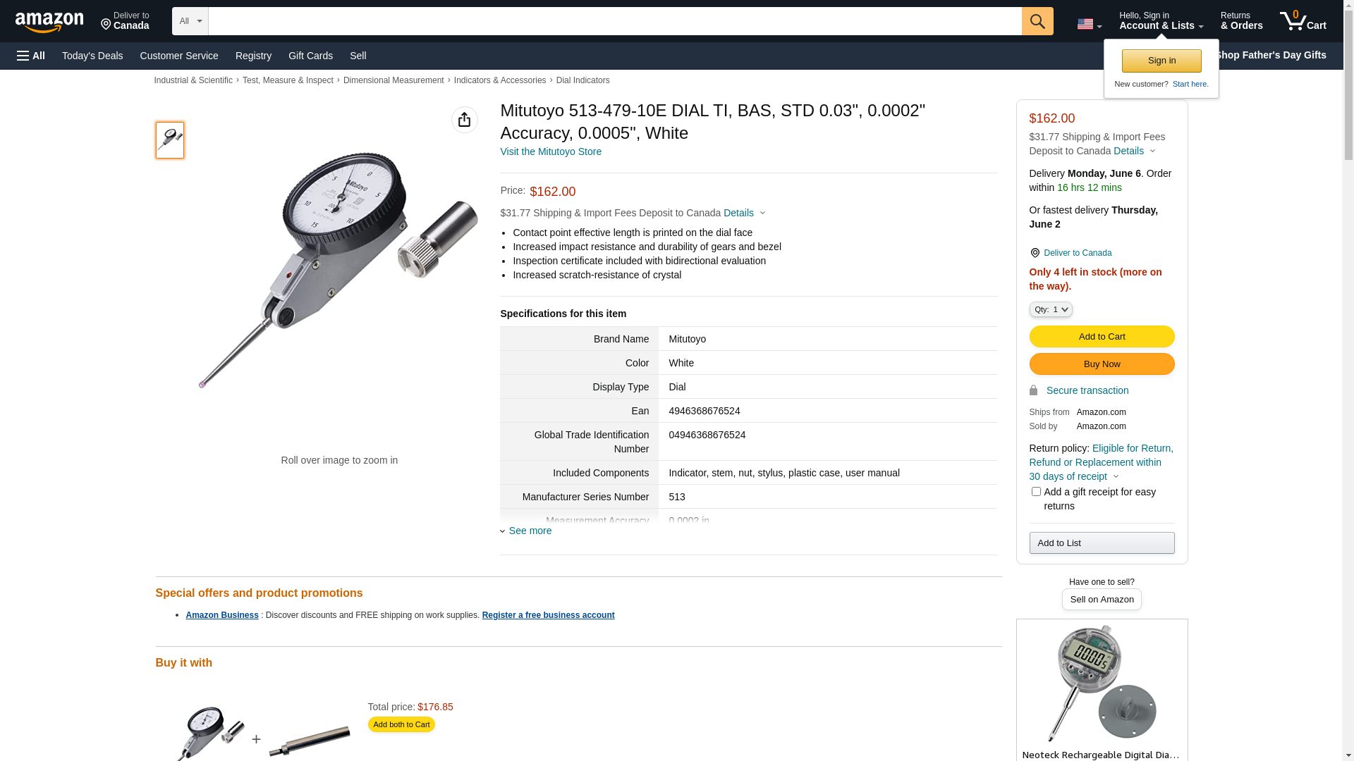 Mitutoyo 513-479-10E DIAL TI, BASIC SET, STANDARD, .03 IN, .0005 IN GRAD, LONG TIP, RUBY TIP, WHITE DIAL